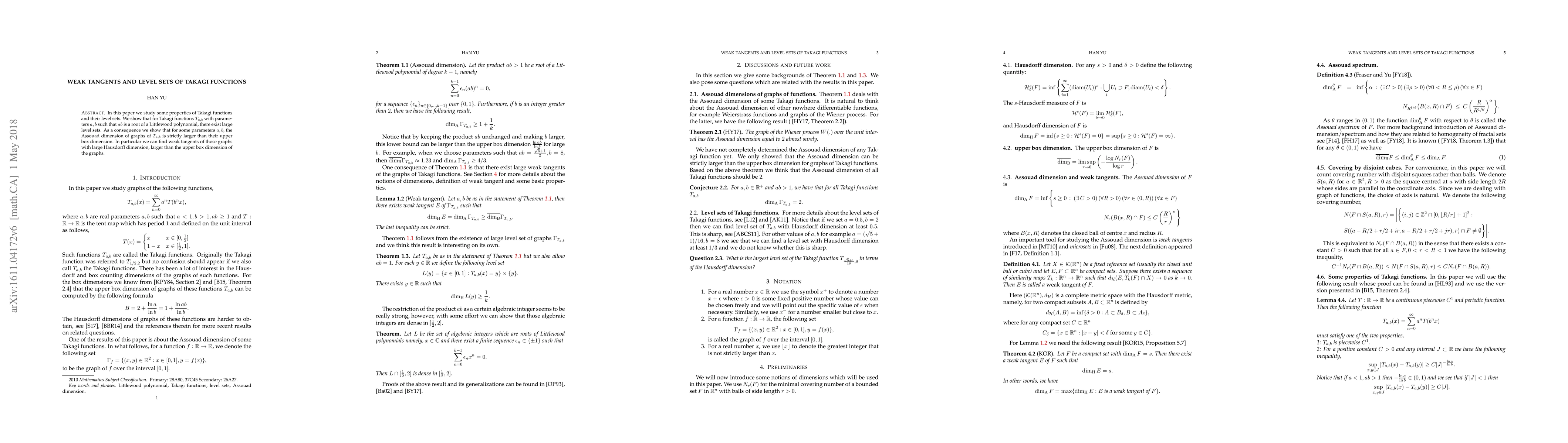 In this paper we study some properties of Takagi functions and their level sets. We show that for Takagi functions $T_{a,b}$ with parameters $a,b$ such that $ab$ is a root of a Littlewood polynomial, there exist large level sets. As a consequence we show that for some parameters $a,b$, the Assouad dimension of graphs of $T_{a,b}$ is strictly larger than their upper box dimension. In particular we can find weak tangents of those graphs with large Hausdorff dimension, larger than the upper box dimension of the graphs.