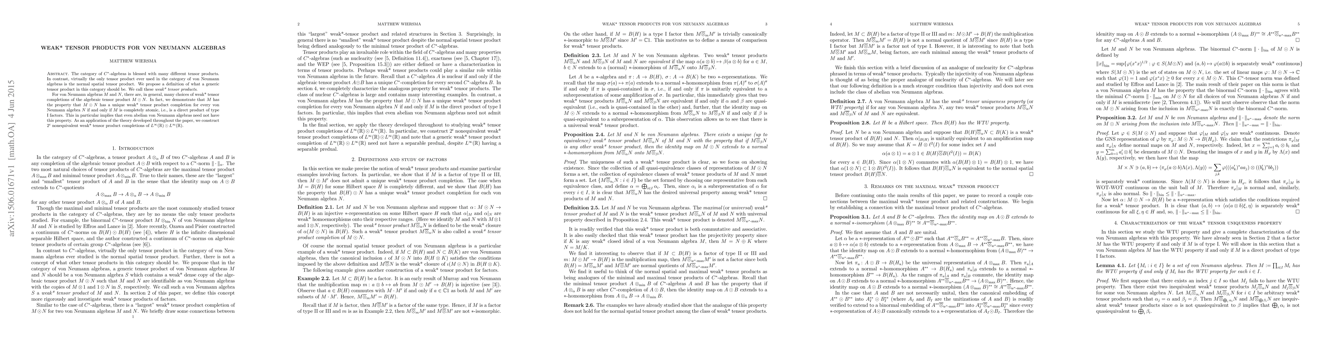 The paper introduces the concept of weak* tensor products for von Neumann algebras, proposing them as a generic tensor product alternative to the normal spatial tensor product. It demonstrates that only completely atomic von Neumann algebras, specifically direct products of type I factors, allow unique weak* tensor product completions for any tensor product with another von Neumann algebra, highlighting that even abelian algebras may lack this property.