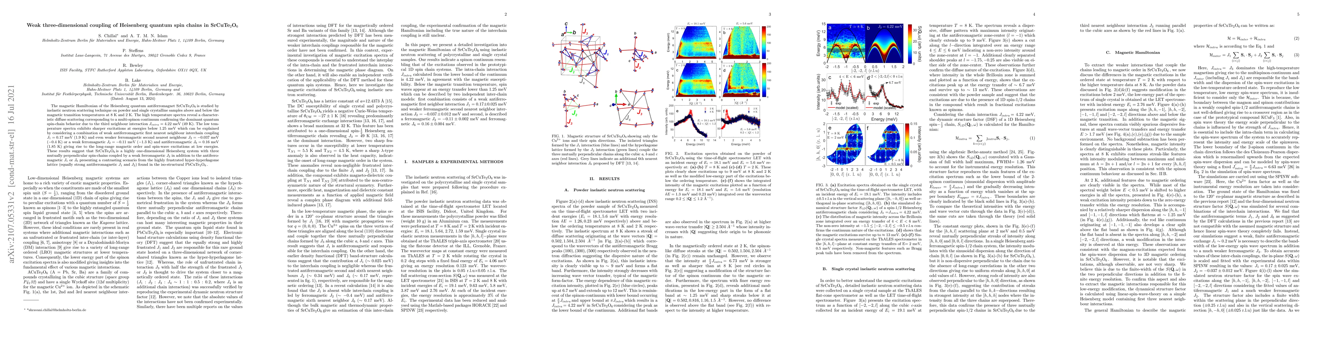 The magnetic Hamiltonian of the Heisenberg quantum antiferromagnet SrCuTe$_{2}$O$_{6}$ is studied by inelastic neutron scattering technique on powder and single crystalline samples above and below the magnetic transition temperatures at 8 K and 2 K. The high temperature spectra reveal a characteristic diffuse scattering corresponding to a multi-spinon continuum confirming the dominant quantum spin-chain behavior due to the third neighbour interaction J$_{intra}$ = 4.22 meV (49 K). The low temperature spectra exhibits sharper excitations at energies below 1.25 meV which can be explained by considering a combination of weak antiferromagnetic first nearest neighbour interchain coupling J$_1$ = 0.17 meV (1.9 K) and even weaker ferromagnetic second nearest neighbour J$_2$ = -0.037 meV (-0.4 K) or a weak ferromagnetic J$_2$ = -0.11 meV (-1.3 K) and antiferromagnetic J$_6$ = 0.16 meV (1.85 K) giving rise to the long-range magnetic order and spin-wave excitations at low energies. These results suggest that SrCuTe$_{2}$O$_{6}$ is a highly one-dimensional Heisenberg system with three mutually perpendicular spin-chains coupled by a weak ferromagnetic J$_2$ in addition to the antiferromagnetic J$_1$ or J$_6$ presenting a contrasting scenario from the highly frustrated hyper-hyperkagome lattice (equally strong antiferromagnetic J$_1$ and J$_2$) found in the iso-structural PbCuTe$_{2}$O$_{6}$.