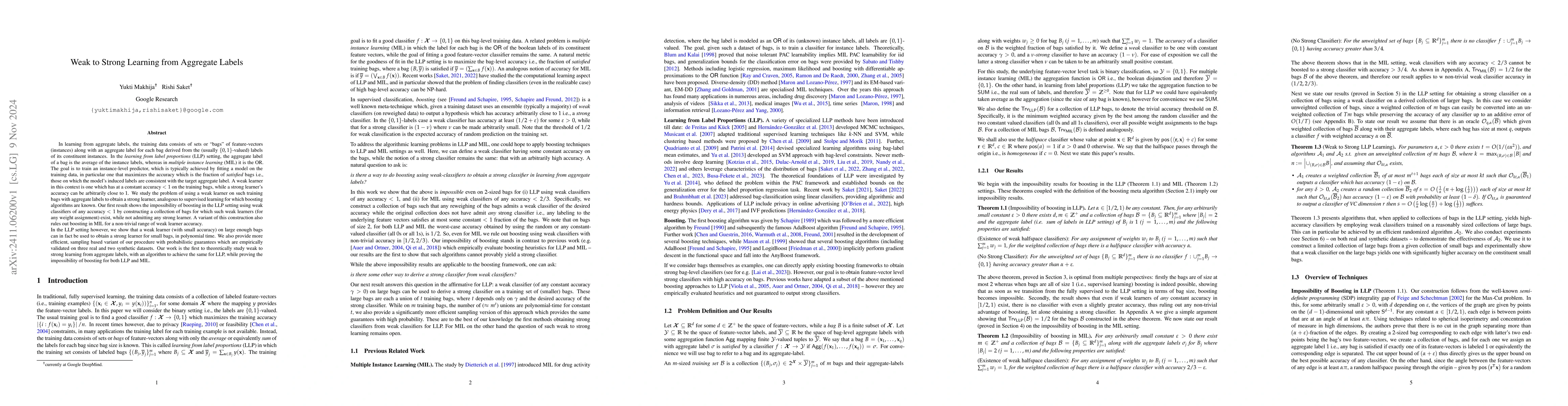 This paper explores the challenge of transforming weak learners into strong learners using training data with aggregate labels, demonstrating the impossibility of boosting in learning from label proportions (LLP) and multiple instance learning (MIL) with weak classifiers. It presents an algorithm for achieving strong learning from weak learners in LLP for small bags, along with a more efficient probabilistic sampling variant validated on various datasets.
