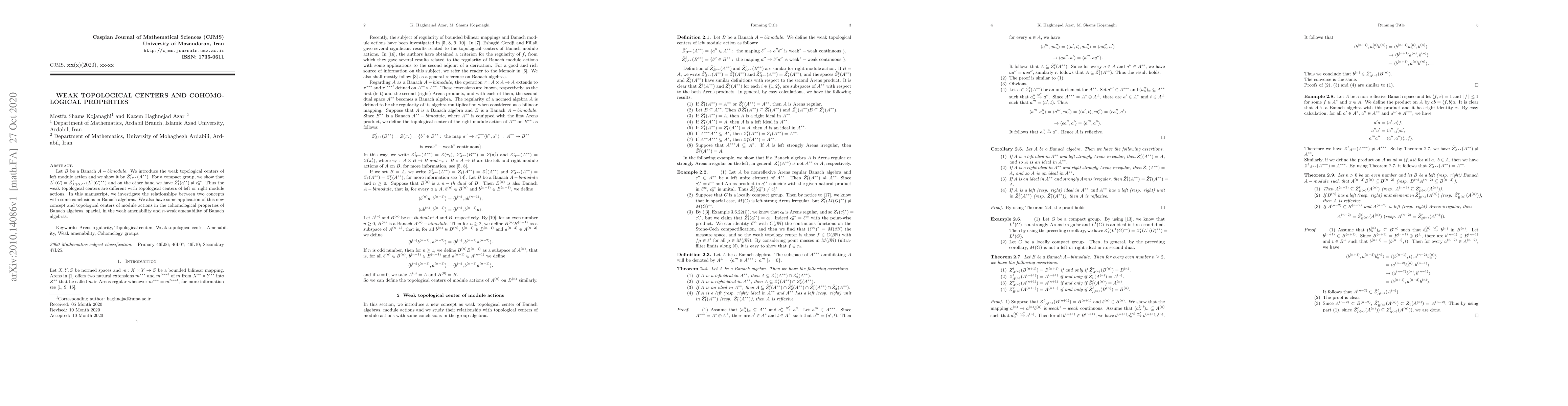 This paper introduces the concept of weak topological centers in Banach $A$-bimodules and demonstrates their distinction from topological centers of module actions. It applies these concepts to Banach algebras, particularly in exploring their implications for cohomological properties, including weak amenability and $n$-weak amenability.