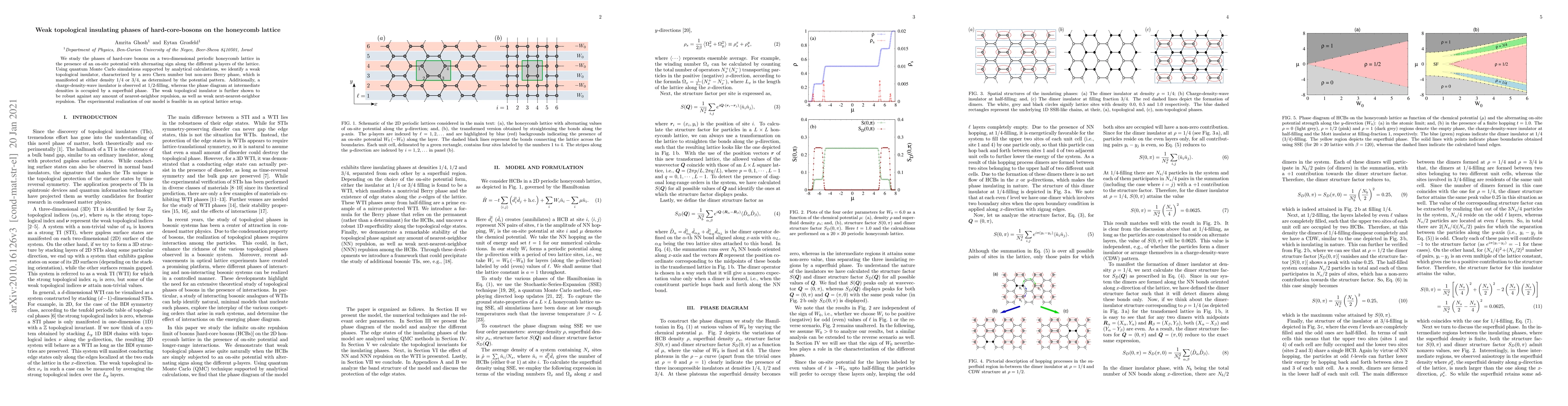 This paper identifies a weak topological insulating phase in hard-core-bosons on a honeycomb lattice with alternating on-site potentials, characterized by a non-zero Berry phase but zero Chern number. It also observes a charge-density-wave phase at half-filling and a superfluid phase at intermediate densities, with the topological insulator being robust against various repulsions.