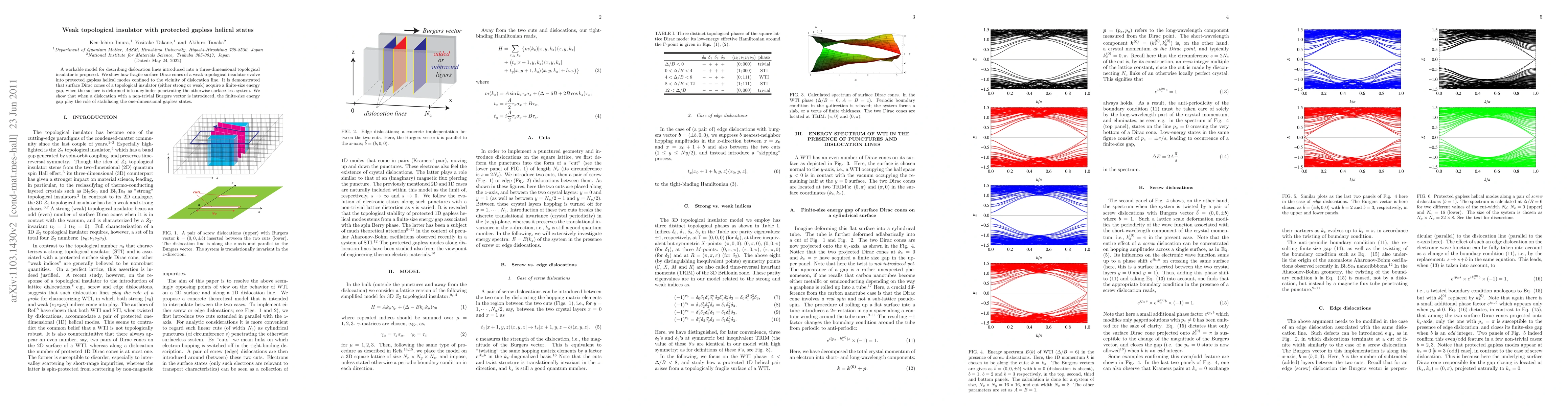 A workable model for describing dislocation lines introduced into a three-dimensional topological insulator is proposed. We show how fragile surface Dirac cones of a weak topological insulator evolve into protected gapless helical modes confined to the vicinity of dislocation line. It is demonstrated that surface Dirac cones of a topological insulator (either strong or weak) acquire a finite-size energy gap, when the surface is deformed into a cylinder penetrating the otherwise surface-less system. We show that when a dislocation with a non-trivial Burgers vector is introduced, the finite-size energy gap play the role of stabilizing the one-dimensional gapless states.