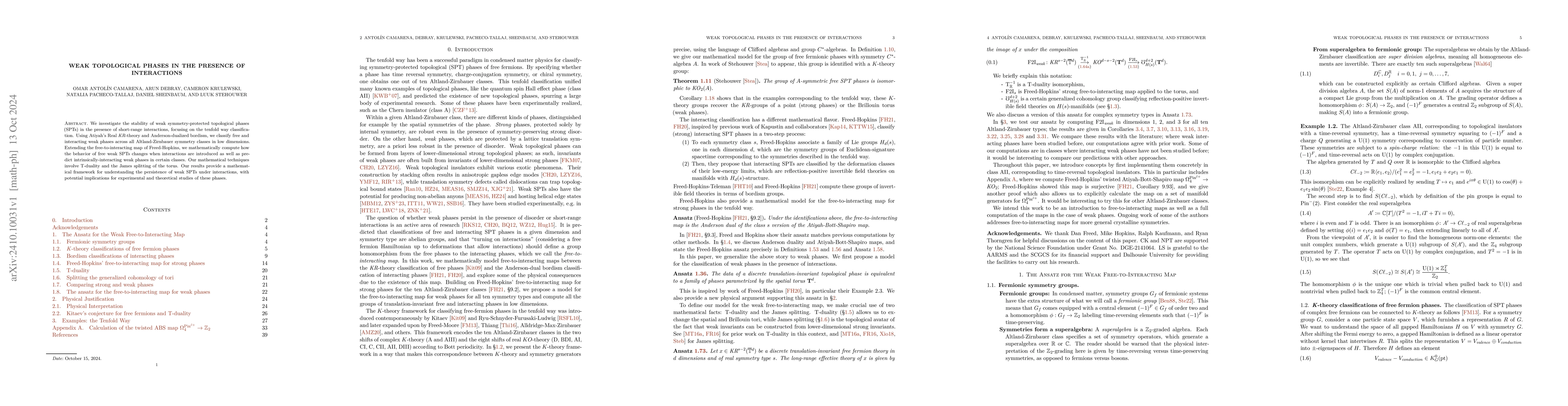 We investigate the stability of weak symmetry-protected topological phases (SPTs) in the presence of short-range interactions, focusing on the tenfold way classification. Using Atiyah's Real $\mathit{KR}$-theory and Anderson-dualized bordism, we classify free and interacting weak phases across all Altland-Zirnbauer symmetry classes in low dimensions. Extending the free-to-interacting map of Freed-Hopkins, we mathematically compute how the behavior of free weak SPTs changes when interactions are introduced as well as predict intrinsically-interacting weak phases in certain classes. Our mathematical techniques involve T-duality and the James splitting of the torus. Our results provide a mathematical framework for understanding the persistence of weak SPTs under interactions, with potential implications for experimental and theoretical studies of these phases.