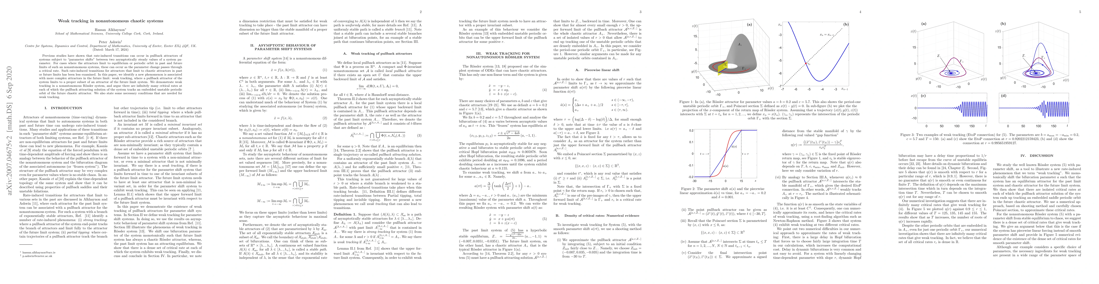 Previous studies have shown that rate-induced transitions can occur in pullback attractors of systems subject to "parameter shifts" between two asymptotically steady values of a system parameter. For cases where the attractors limit to equilibrium or periodic orbit in past and future limits of such an nonautonomous systems, these can occur as the parameter change passes through a critical rate. Such rate-induced transitions for attractors that limit to chaotic attractors in past or future limits has been less examined. In this paper, we identify a new phenomenon is associated with more complex attractors in the future limit: weak tracking, where a pullback attractor of the system limits to a proper subset of an attractor of the future limit system. We demonstrate weak tracking in a nonautonomous R\"ossler system, and argue there are infinitely many critical rates at each of which the pullback attracting solution of the system tracks an embedded unstable periodic orbit of the future chaotic attractor. We also state some necessary conditions that are needed for weak tracking.