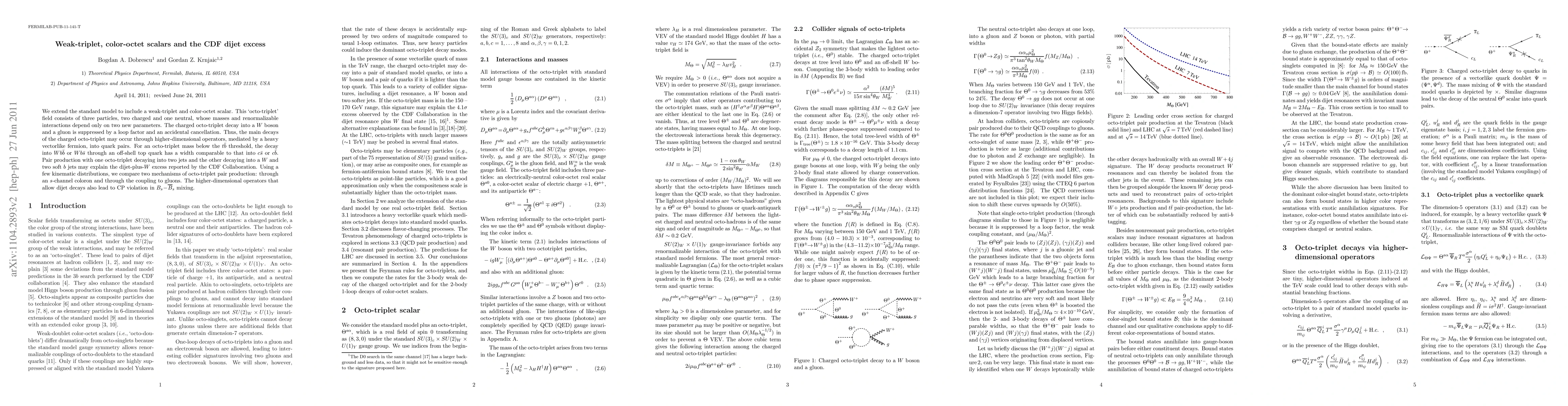 We extend the standard model to include a weak-triplet and color-octet scalar. This `octo-triplet' field consists of three particles, two charged and one neutral, whose masses and renormalizable interactions depend only on two new parameters. The charged octo-triplet decay into a W boson and a gluon is suppressed by a loop factor and an accidental cancellation. Thus, the main decays of the charged octo-triplet may occur through higher-dimensional operators, mediated by a heavy vectorlike fermion, into quark pairs. For an octo-triplet mass below the t\bar{b} threshold, the decay into Wb\bar{b} or Wb\bar{s} through an off-shell top quark has a width comparable to that into c\bar{s} or c\bar{b}. Pair production with one octo-triplet decaying into two jets and the other decaying into a W and two soft b jets may explain the dijet-plus-W excess reported by the CDF Collaboration. Using a few kinematic distributions, we compare two mechanisms of octo-triplet pair production: through an s-channel coloron and through the coupling to gluons. The higher-dimensional operators that allow dijet decays also lead to CP violation in B_s - \bar B_s mixing.