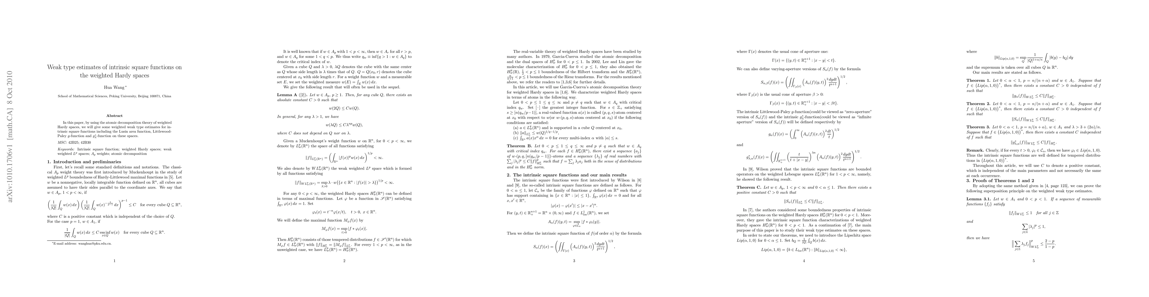 Summary: This paper utilizes atomic decomposition theory in weighted Hardy spaces to derive weighted weak type estimates for intrinsic square functions, including the Lusin area function, Littlewood-Paley $g$-function, and $g^*_\lambda$-function. These results enhance the understanding of the behavior of these functions within the context of weighted Hardy spaces.