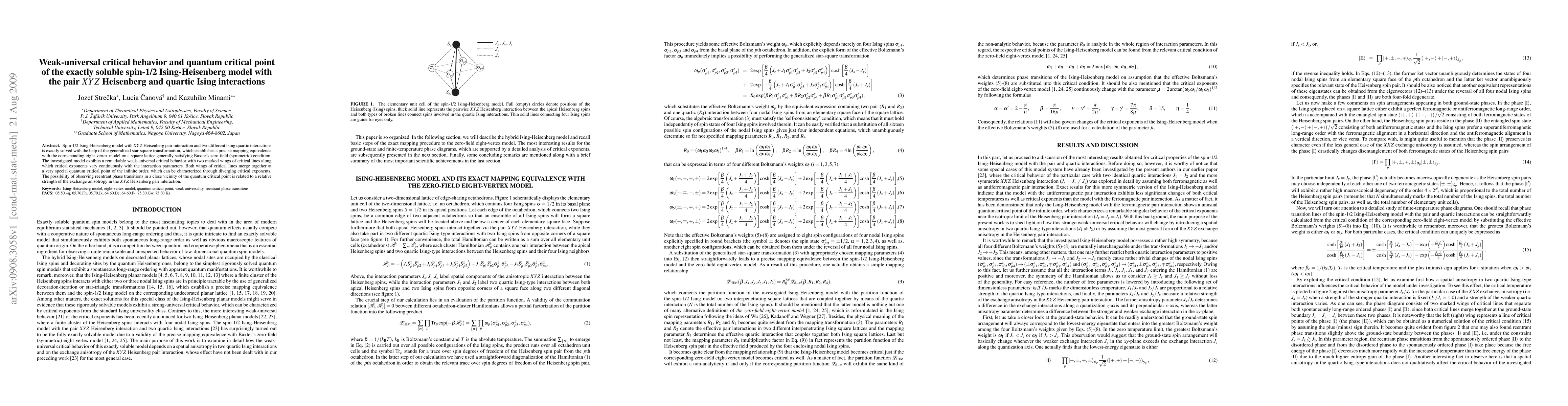 Spin-1/2 Ising-Heisenberg model with XYZ Heisenberg pair interaction and two different Ising quartic interactions is exactly solved with the help of the generalized star-square transformation, which establishes a precise mapping equivalence with the corresponding eight-vertex model on a square lattice generally satisfying Baxter's zero-field (symmetric) condition. The investigated model exhibits a remarkable weak-universal critical behavior with two marked wings of critical lines along which critical exponents vary continuously with the interaction parameters. Both wings of critical lines merge together at a very special quantum critical point of the infinite order, which can be characterized through diverging critical exponents. The possibility of observing reentrant phase transitions in a close vicinity of the quantum critical point is related to a relative strength of the exchange anisotropy in the XYZ Heisenberg pair interaction.