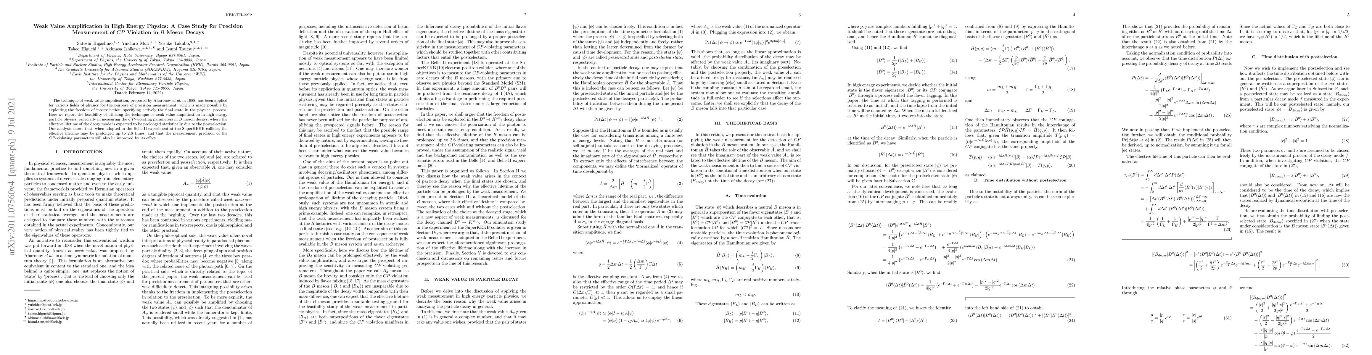 This paper explores the application of weak value amplification in high energy physics to enhance precision measurements of CP violation in B meson decays. The technique, which leverages postselection to prolong the effective decay lifetime, shows potential to improve the measurement precision of CP-violating parameters by up to 2.6 times in the Belle II experiment.