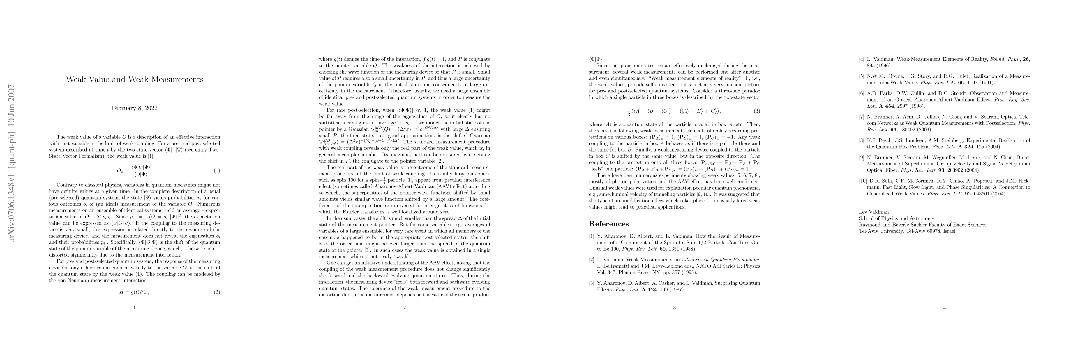 Summary: This paper explores the concept of weak values in quantum mechanics, emphasizing their significance in weak coupling interactions for pre- and post-selected quantum systems. It highlights the implications of weak measurements in understanding quantum phenomena.