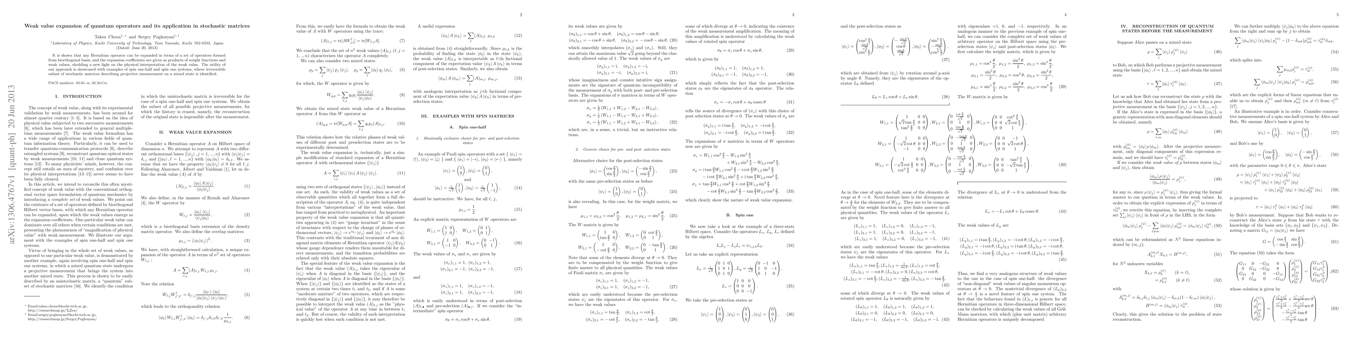 It is shown that any Hermitian operator can be expanded in terms of a set of operators formed from biorthogonal basis, and the expansion coefficients are given as products of weight functions and weak values, shedding a new light on the physical interpretation of the weak value. The utility of our approach is showcased with examples of spin one-half and spin one systems, where irreversible subset of stochastic matrices describing projective measurement on a mixed state is identified.