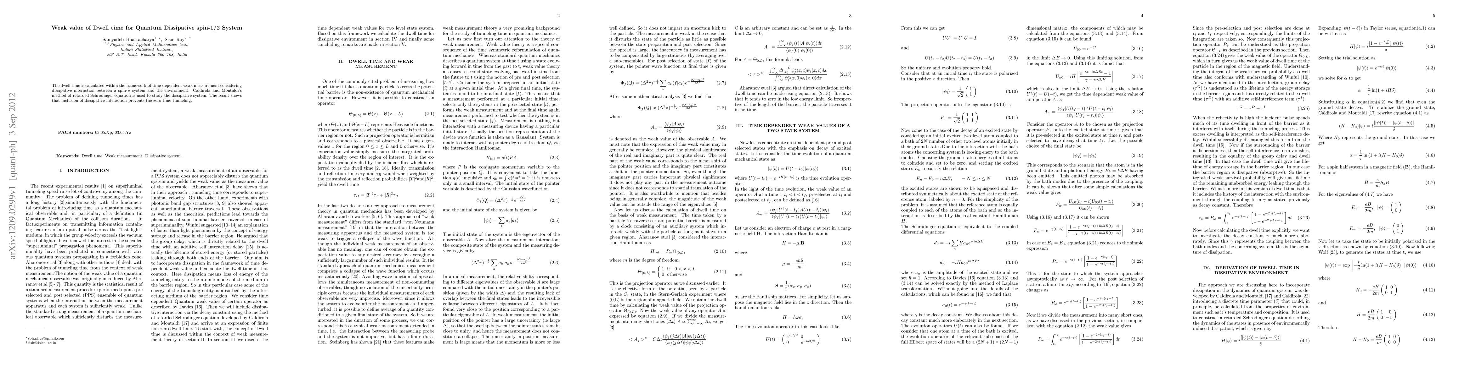The dwell time is calculated within the framework of time dependent weak measurement considering dissipative interaction between a spin half system and the environment. Caldirola and Montaldi's method of retarded Schroedinger equation is used to study the dissipative system. The result shows that inclusion of dissipative interaction prevents zero time tunneling.