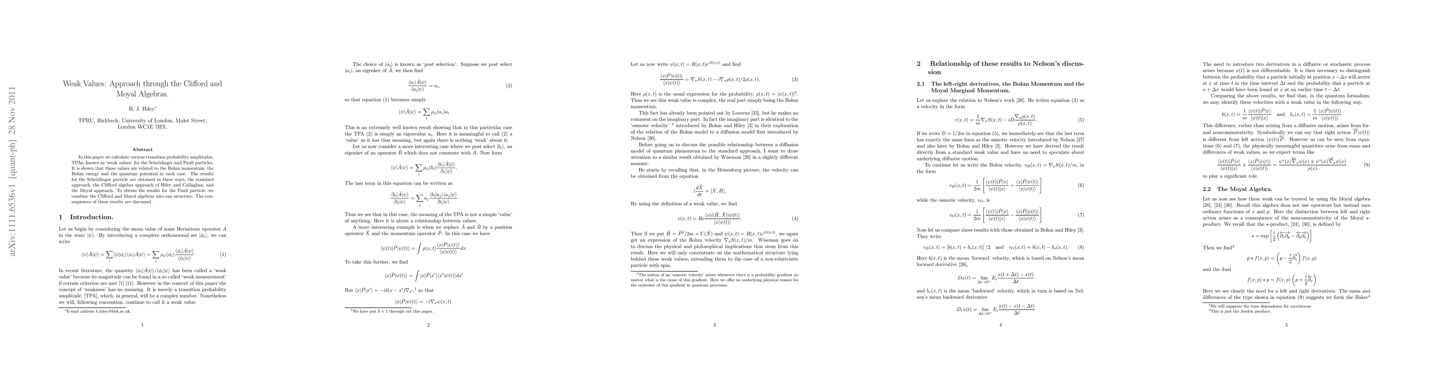 In this paper we calculate various transition probability amplitudes, TPAs, known as `weak values' for the Schrodinger and Pauli particles. It is shown that these values are related to the Bohm momentum, the Bohm energy and the quantum potential in each case. The results for the Schrodinger particle are obtained in three ways, the standard approach, the Clifford algebra approach of Hiley and Callaghan, and the Moyal approach. To obtain the results for the Pauli particle, we combine the Clifford and Moyal algebras into one structure. The consequences of these results are discussed.