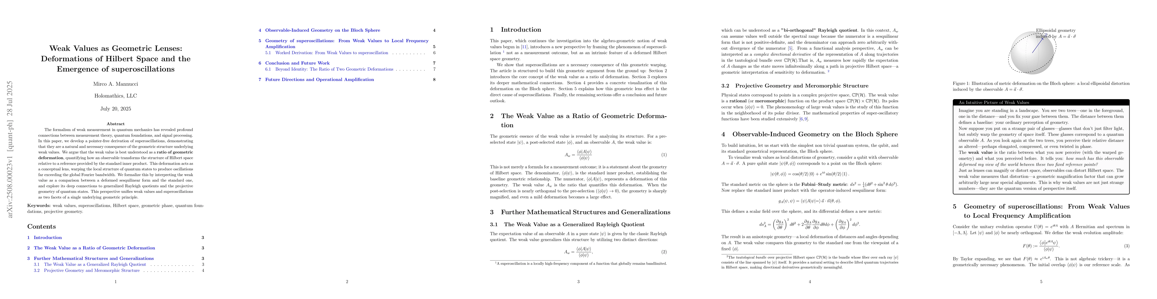 The formalism of weak measurement in quantum mechanics has revealed profound connections between measurement theory, quantum foundations, and signal processing. In this paper, we develop a pointer-free derivation of superoscillations, demonstrating that they are a natural and necessary consequence of the geometric structure underlying weak values. We argue that the weak value is best understood as a ratio of geometric deformation, quantifying how an observable transforms the structure of Hilbert space relative to a reference provided by the standard inner product. This deformation acts as a conceptual lens, warping the local structure of quantum states to produce oscillations far exceeding the global Fourier bandwidth. We formalize this by interpreting the weak value as a comparison between a deformed sesquilinear form and the standard one, and explore its deep connections to generalized Rayleigh quotients and the projective geometry of quantum states. This perspective unifies weak values and superoscillations as two facets of a single underlying geometric principle.