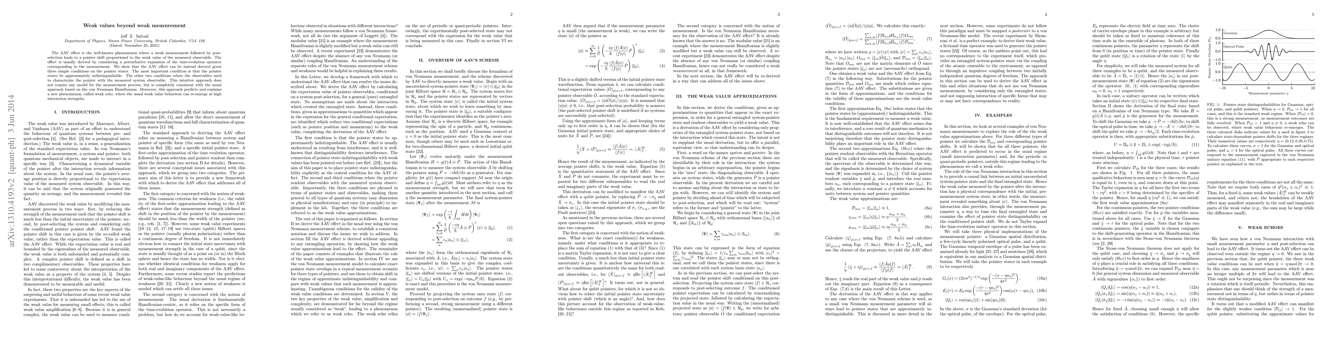 This paper demonstrates that the AAV effect can be derived through three conditions on pointer states without relying on a perturbative expansion, showing that the pointer states must be approximately indistinguishable. It also introduces a new phenomenon called weak echo, where weak value behavior reappears at high interaction strengths.