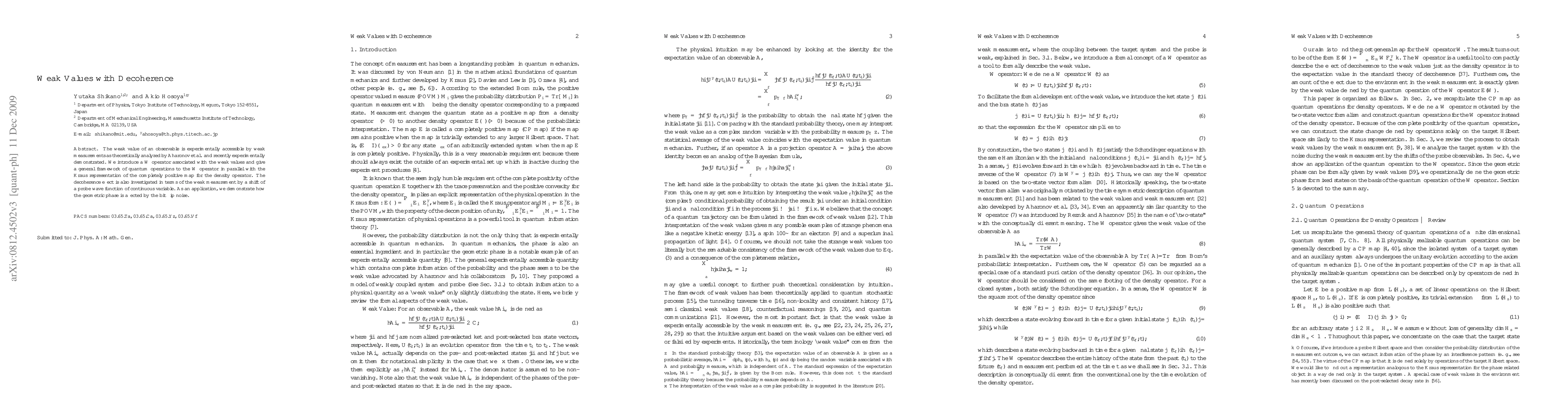 The weak value of an observable is experimentally accessible by weak measurements as theoretically analyzed by Aharonov et al. and recently experimentally demonstrated. We introduce a weak operator associated with the weak values and give a general framework of quantum operations to the W operator in parallel with the Kraus representation of the completely positive map for the density operator. The decoherence effect is also investigated in terms of the weak measurement by a shift of a probe wave function of continuous variable. As an application, we demonstrate how the geometric phase is affected by the bit flip noise.