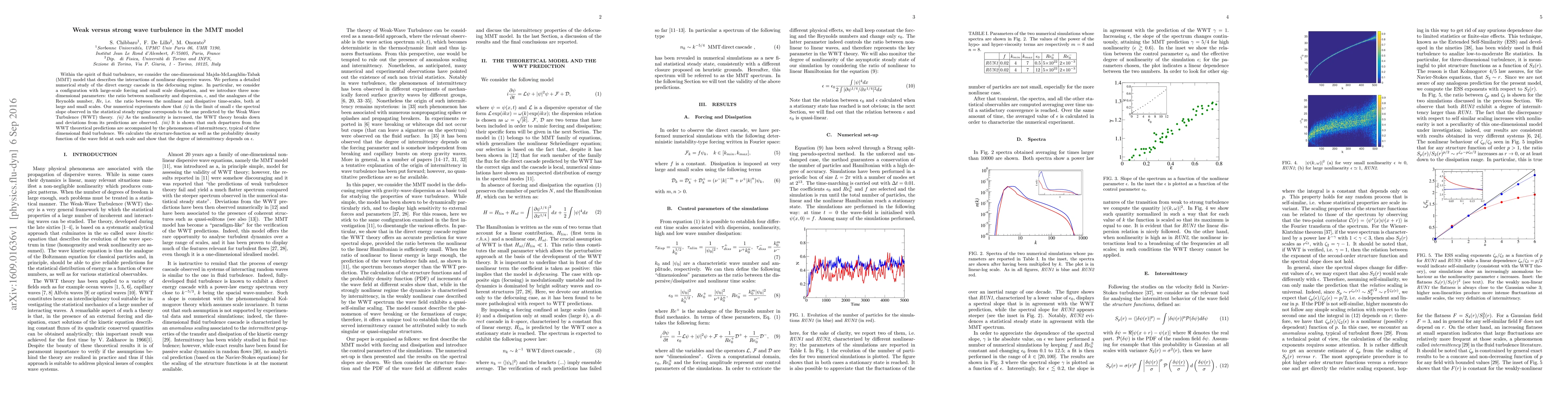 Within the spirit of fluid turbulence, we consider the one-dimensional Majda-McLaughlin-Tabak (MMT) model that describes the interactions of nonlinear dispersive waves. We perform a detailed numerical study of the direct energy cascade in the defocusing regime. In particular, we consider a configuration with large-scale forcing and small scale dissipation, and we introduce three non- dimensional parameters: the ratio between nonlinearity and dispersion, {\epsilon}, and the analogues of the Reynolds number, Re, i.e. the ratio between the nonlinear and dissipative time-scales, both at large and small scales. Our numerical experiments show that (i) in the limit of small {\epsilon} the spectral slope observed in the statistical steady regime corresponds to the one predicted by the Weak Wave Turbulence (WWT) theory. (ii) As the nonlinearity is increased, the WWT theory breaks down and deviations from its predictions are observed. (iii) It is shown that such departures from the WWT theoretical predictions are accompanied by the phenomenon of intermittency, typical of three dimensional fluid turbulence. We calculate the structure-function as well as the probability density function of the wave field at each scale and show that the degree of intermittency depends on {\epsilon}.