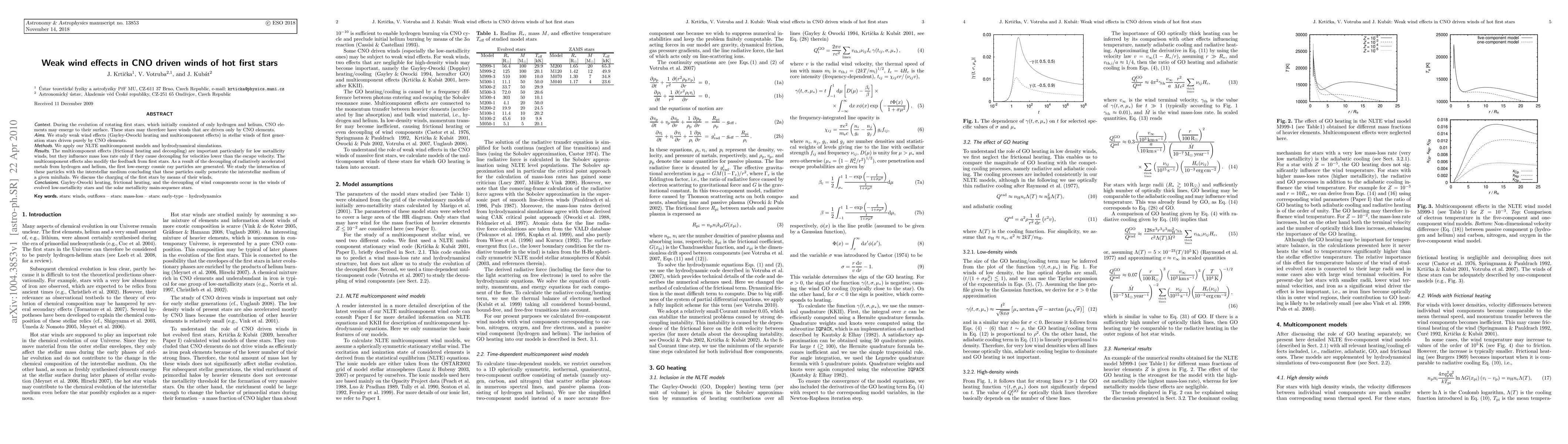 This paper investigates the weak wind effects in CNO-driven winds of hot first stars, focusing on Gayley-Owocki heating and multicomponent interactions. It finds that these effects significantly influence mass loss rates and feedback mechanisms, generating low-energy cosmic rays that penetrate the interstellar medium.