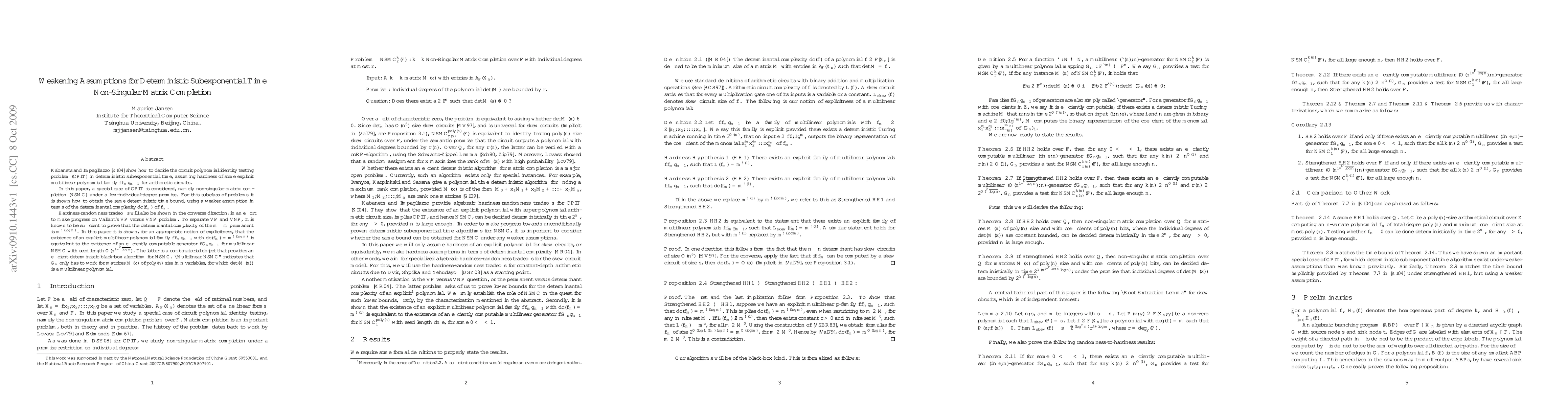 This paper demonstrates a deterministic subexponential time algorithm for low-degree non-singular matrix completion (NSMC) using a weaker assumption than previously required. It also explores the equivalence between the determinantal complexity of the permanent and the existence of an efficient generator for multilinear NSMC, contributing to the VP versus VNP problem.