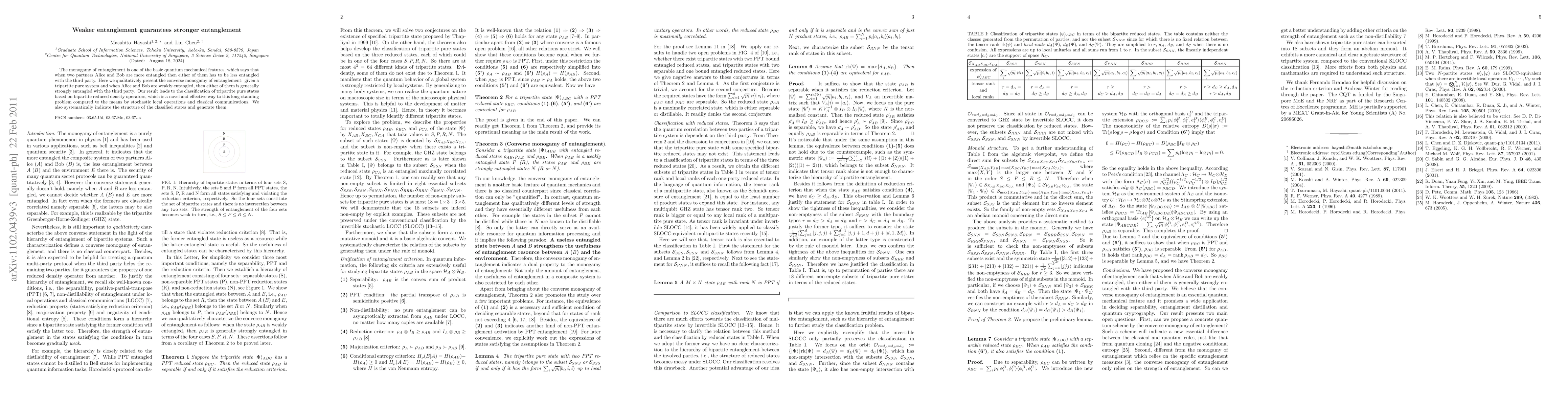 The monogamy of entanglement is one of the basic quantum mechanical features, which says that when two partners Alice and Bob are more entangled then either of them has to be less entangled with the third party. Here we qualitatively present the converse monogamy of entanglement: given a tripartite pure system and when Alice and Bob are weakly entangled, then either of them is generally strongly entangled with the third party. Our result leads to the classification of tripartite pure states based on bipartite reduced density operators, which is a novel and effective way to this long-standing problem compared to the means by stochastic local operations and classical communications. We also systematically indicate the structure of the classified states and generate them.