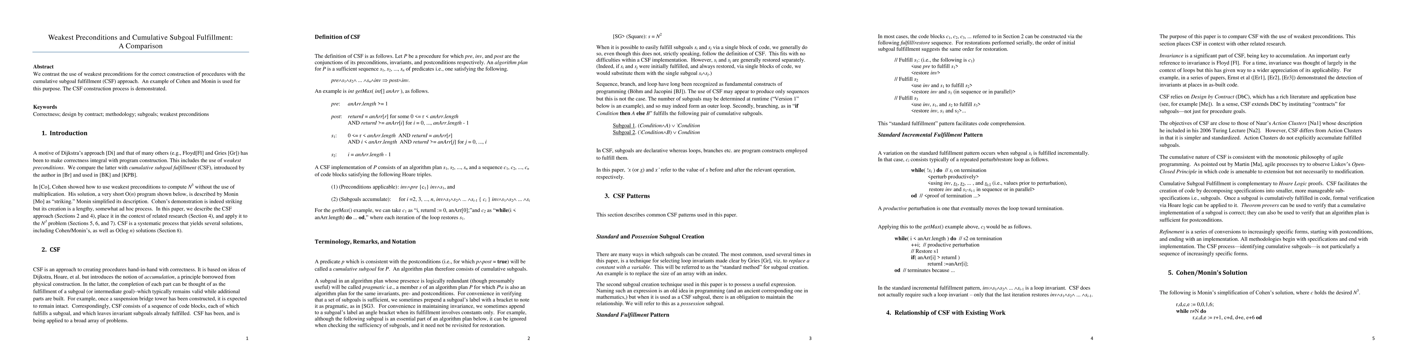 We contrast the use of weakest preconditions for the correct construction of procedures with the cumulative subgoal fulfillment (CSF) approach. An example of Cohen and Monin is used for this purpose. The CSF construction process is demonstrated.