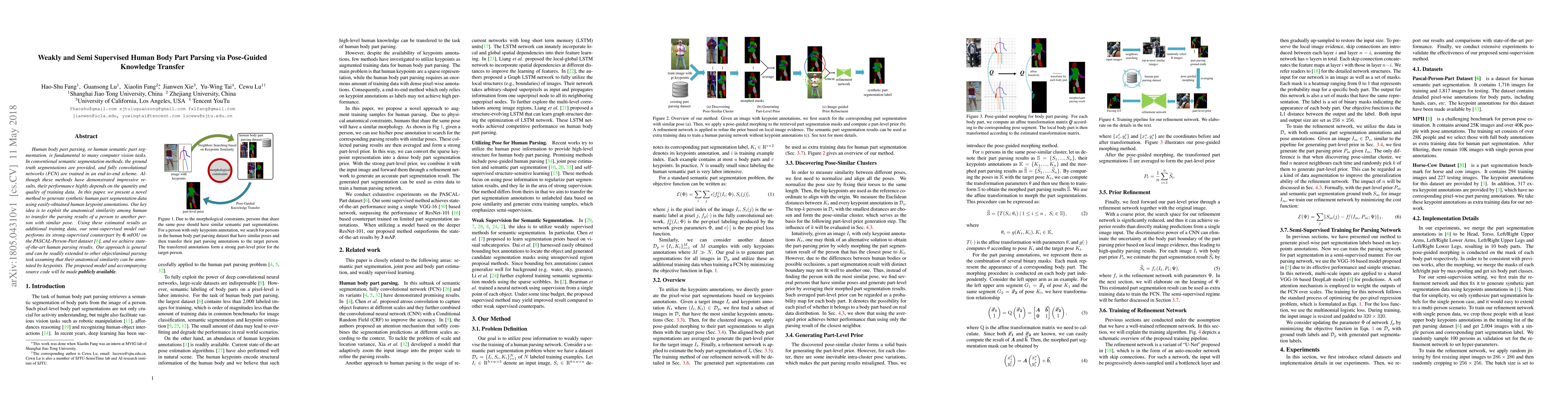This paper introduces a novel semi-supervised method for human body part parsing using pose-guided knowledge transfer, generating synthetic segmentation data from keypoint annotations to enhance training. The approach significantly outperforms fully supervised methods by leveraging anatomical similarities among humans, achieving state-of-the-art results on the PASCAL-Person-Part dataset.