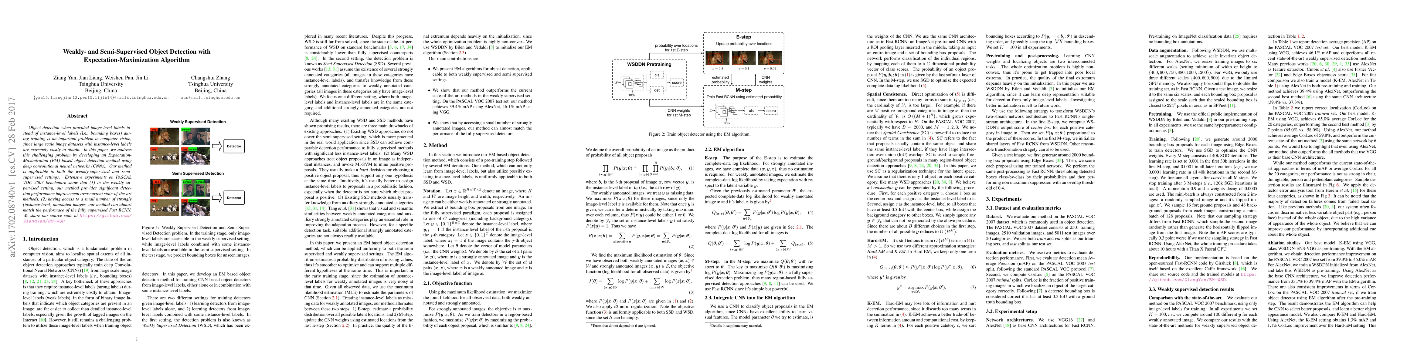 This paper proposes an Expectation-Maximization (EM) based method for object detection using deep CNNs, applicable to weakly- and semi-supervised settings. Experiments on PASCAL VOC 2007 show significant performance gains over current methods in weakly-supervised scenarios and near-full performance matching in semi-supervised settings.