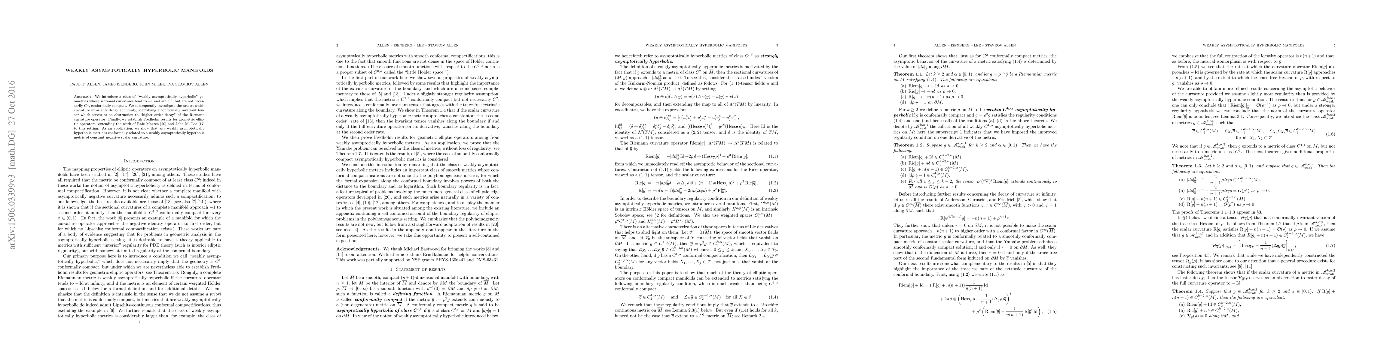 This paper introduces 'weakly asymptotically hyperbolic' geometries with curvatures approaching -1 at a C^0 level, not necessarily C^1, conformally compact. It identifies a conformally invariant tensor as an obstacle to 'higher order decay' of Riemann curvature, and proves Fredholm results for geometric elliptic operators, extending previous work. As an application, it shows any weakly asymptotically hyperbolic metric can be conformally related to one of constant negative curvature.