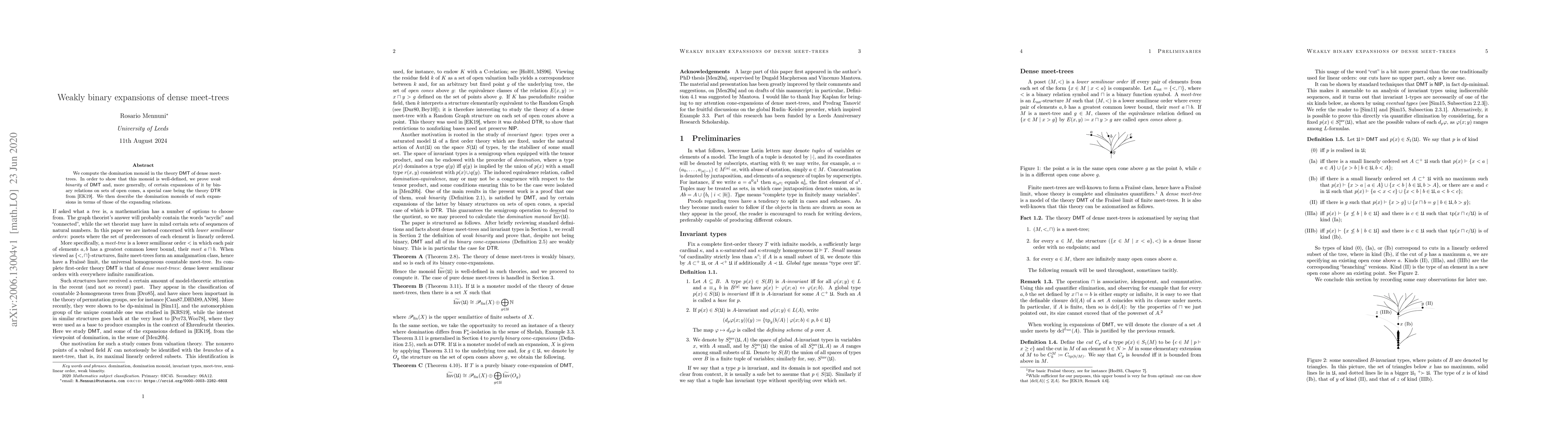 This paper computes the domination monoid in the theory of dense meet-trees (DMT) and proves the weak binarity of DMT and its expansions by binary relations. It describes the domination monoids of these expansions in terms of the expanding relations.
