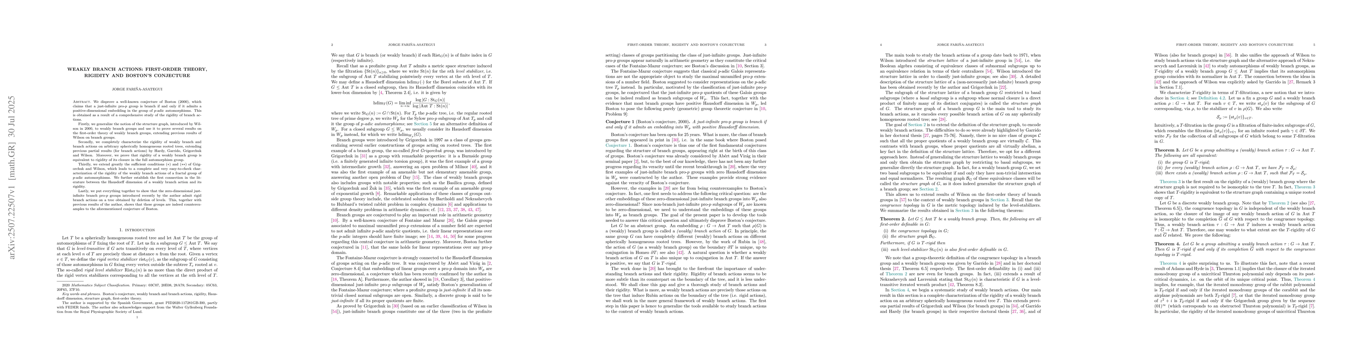 We disprove a well-known conjecture of Boston (2000), which claims that a just-infinite pro-$p$ group is branch if and only if it admits a positive-dimensional embedding in the group of $p$-adic automorphisms. This is obtained as a result of a comprehensive study of the rigidity of branch actions. Firstly, we generalize the notion of the structure graph, introduced by Wilson in 2000, to weakly branch groups and use it to prove several results on the first-order theory of weakly branch groups, extending previous results of Wilson on branch groups. Secondly, we completely characterize the rigidity of weakly branch and branch actions on arbitrary spherically homogeneous rooted trees, extending previous partial results (for branch actions) by Hardy, Garrido, Grigorchuk and Wilson. Moreover, we prove that rigidity of a weakly branch group is equivalent to rigidity of its closure in the full automorphism group. Thirdly, we extend greatly the sufficient conditions $(*)$ and $(**)$ of Grigorchuk and Wilson, which leads to a complete and very easy-to-check characterization of the rigidity of the weakly branch actions of a fractal group of $p$-adic automorphisms. We further establish the first connection in the literature between the Hausdorff dimension of a weakly branch action and its rigidity. Lastly, we put everything together to show that the zero-dimensional just-infinite branch pro-$p$ groups introduced recently by the author admit rigid branch actions on a tree obtained by deletion of levels. This, together with previous results of the author, shows that these groups are indeed counterexamples to the aforementioned conjecture of Boston.