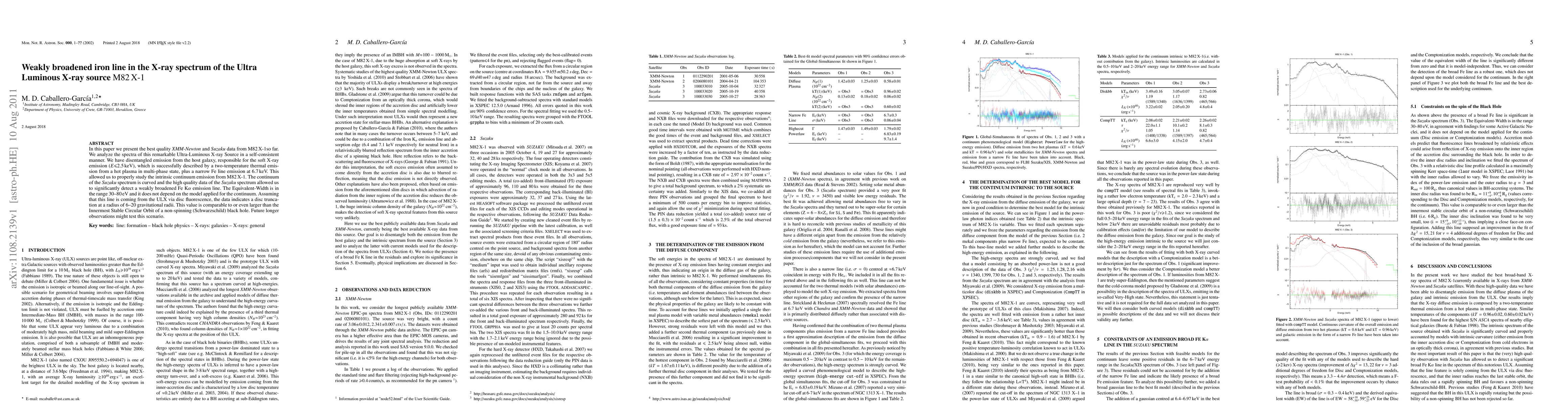 In this paper we present the best quality XMM-Newton and Suzaku data from M82 X-1 so far. We analyze the spectra of this remarkable Ultra-Luminous X-ray Source in a self-consistent manner. We have disentangled emission from the host galaxy, responsible for the soft X-ray emission (E<2.5 keV), which is successfully described by a two-temperature thermal emission from a hot plasma in multi-phase state, plus a narrow Fe line emission at 6.7 keV. This allowed us to properly study the intrinsic continuum emission from M82 X-1. The continuum of the Suzaku spectrum is curved and the high quality data of the Suzaku spectrum allowed us to significantly detect a weakly broadened Fe K-alpha emission line. The Equivalent-Width is in the range 30-80 eV and it does not depend on the model applied for the continuum. Assuming that this line is coming from the ULX via disc fluorescence, the data indicates a disc truncation at a radius of 6-20 gravitational radii. This value is comparable to or even larger than the Innermost Stable Circular Orbit of a non-spinning (Schwarzschild) black hole. Future longer observations might test this scenario.