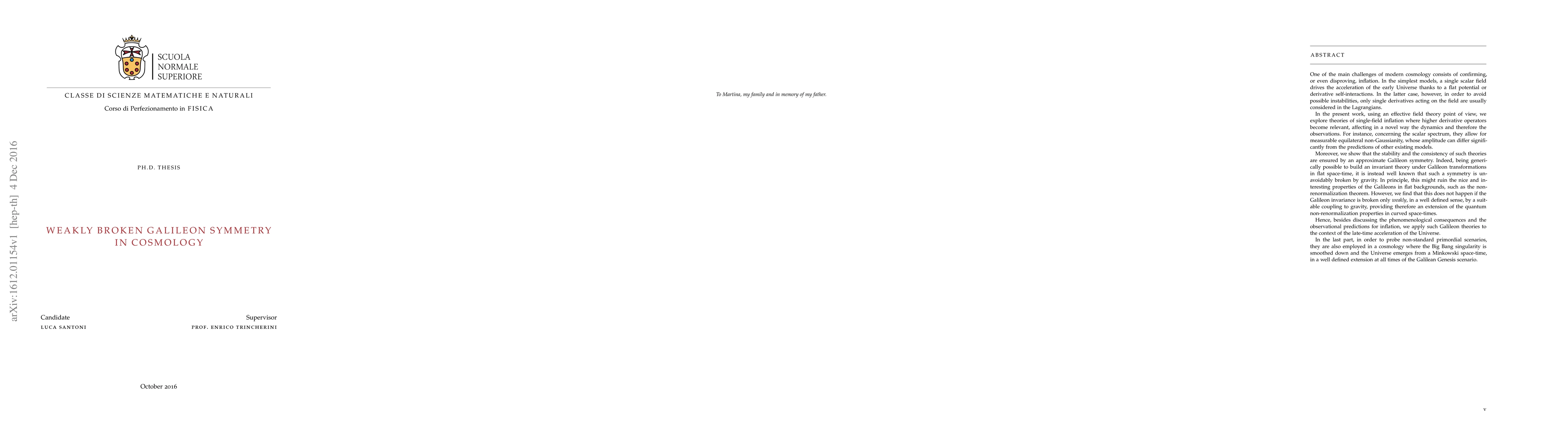 This paper explores single-field inflation models incorporating weakly broken Galileon symmetry, revealing measurable equilateral non-Gaussianity and extending quantum non-renormalization properties to curved space-time. It also applies these theories to late-time cosmic acceleration and scenarios beyond the standard Big Bang model.