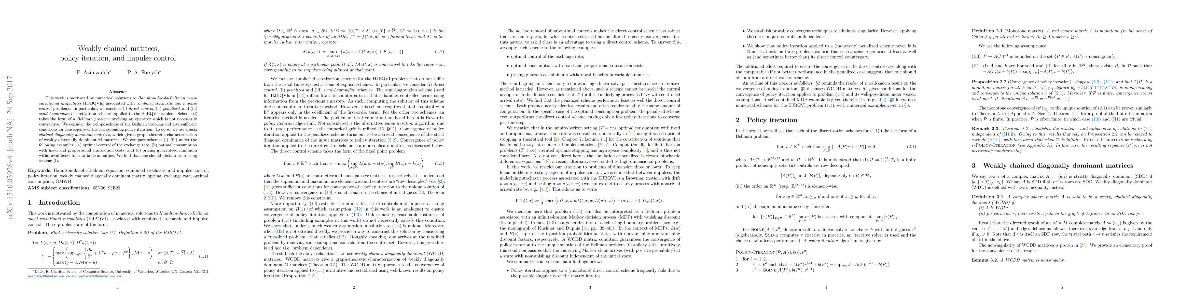 This work is motivated by numerical solutions to Hamilton-Jacobi-Bellman quasi-variational inequalities (HJBQVIs) associated with combined stochastic and impulse control problems. In particular, we consider (i) direct control, (ii) penalized, and (iii) semi-Lagrangian discretization schemes applied to the HJBQVI problem. Scheme (i) takes the form of a Bellman problem involving an operator which is not necessarily contractive. We consider the well-posedness of the Bellman problem and give sufficient conditions for convergence of the corresponding policy iteration. To do so, we use weakly chained diagonally dominant matrices, which give a graph-theoretic characterization of weakly diagonally dominant M-matrices. We compare schemes (i)--(iii) under the following examples: (a) optimal control of the exchange rate, (b) optimal consumption with fixed and proportional transaction costs, and (c) pricing guaranteed minimum withdrawal benefits in variable annuities. We find that one should abstain from using scheme (i).