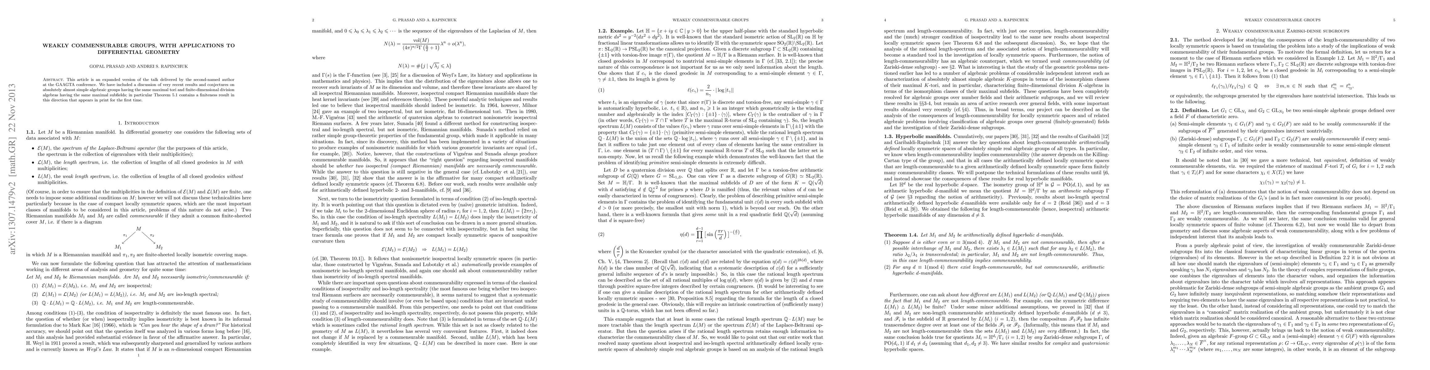 This paper surveys findings on weakly commensurable arithmetic and Zariski-dense subgroups, focusing on length-commensurable and isospectral locally symmetric spaces, and explores implications for semi-simple algebraic groups, including recent results on maximal tori and division algebras.