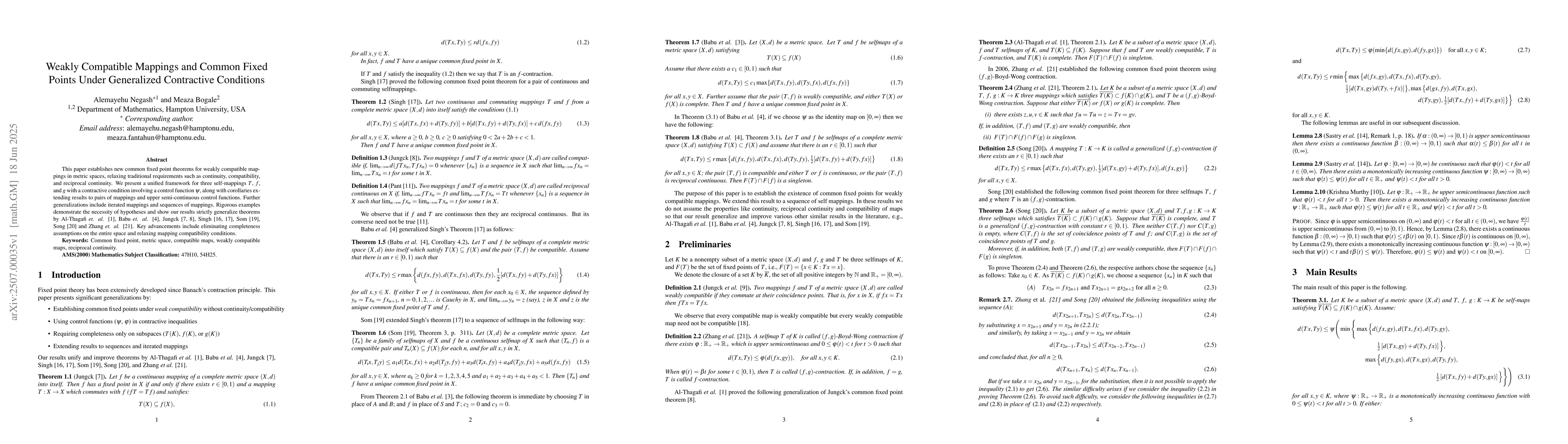 This paper establishes new common fixed point theorems for weakly compatible mappings in metric spaces, relaxing traditional requirements such as continuity, compatibility, and reciprocal continuity. We present a unified framework for three self-mappings $T$, $f$, and $g$ with a contractive condition involving a control function $\psi$, along with corollaries extending results to pairs of mappings and upper semi-continuous control functions. Further generalizations include iterated mappings and sequences of mappings. Rigorous examples demonstrate the necessity of hypotheses and show our results strictly generalize theorems by Al-Thagafi \emph{et. al.} \cite{Al-Thagafi2006}, Babu \emph{et. al.} \cite{Babu2007}, Jungck \cite{Jungck1976,Jungck1986}, Singh \cite{Singh1986,Singh1997a}, Som \cite{Som2003}, Song \cite{Song2007} and Zhang \emph{et. al.} \cite{Zhang2008}. Key advancements include eliminating completeness assumptions on the entire space and relaxing mapping compatibility conditions.