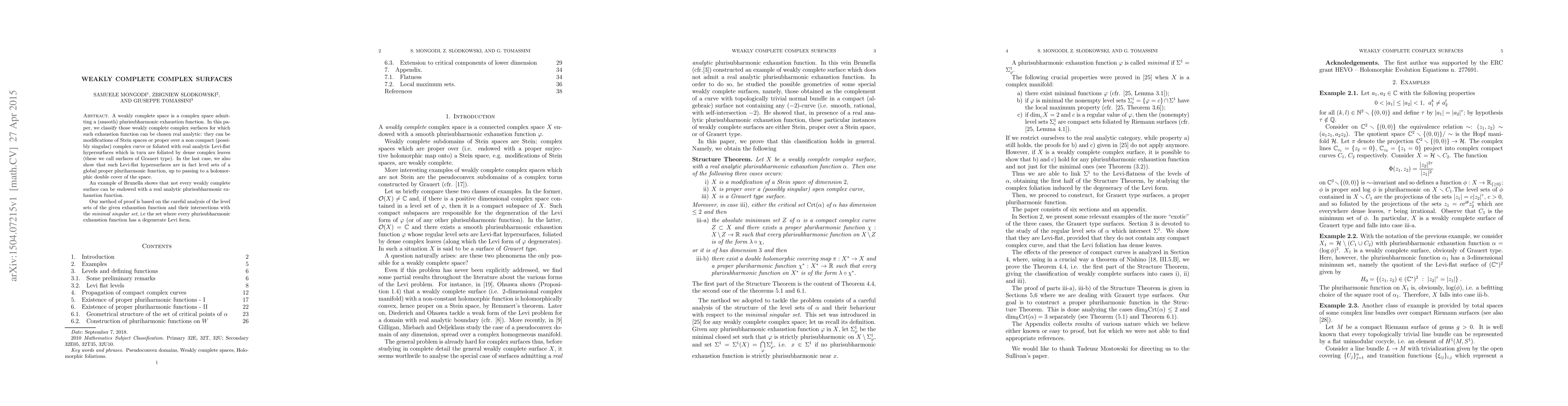 A weakly complete space is a complex space admitting a (smooth) plurisubharmonic exhaustion function. In this paper, we classify those weakly complete complex surfaces for which such exhaustion function can be chosen real analytic: they can be modifications of Stein spaces or proper over a non compact (possibly singular) complex curve or foliated with real analytic Levi-flat hypersurfaces which in turn are foliated by dense complex leaves (these we call surfaces of Grauert type). In the last case, we also show that such Levi-flat hypersurfaces are in fact level sets of a global proper pluriharmonic function, up to passing to a holomorphic double cover of the space. An example of Brunella shows that not every weakly complete surface can be endowed with a real analytic plurisubharmonic exhaustion function. Our method of proof is based on the careful analysis of the level sets of the given exhaustion function and their intersections with the minimal singular set, i.e the set where every plurisubharmonic exhaustion function has a degenerate Levi form.