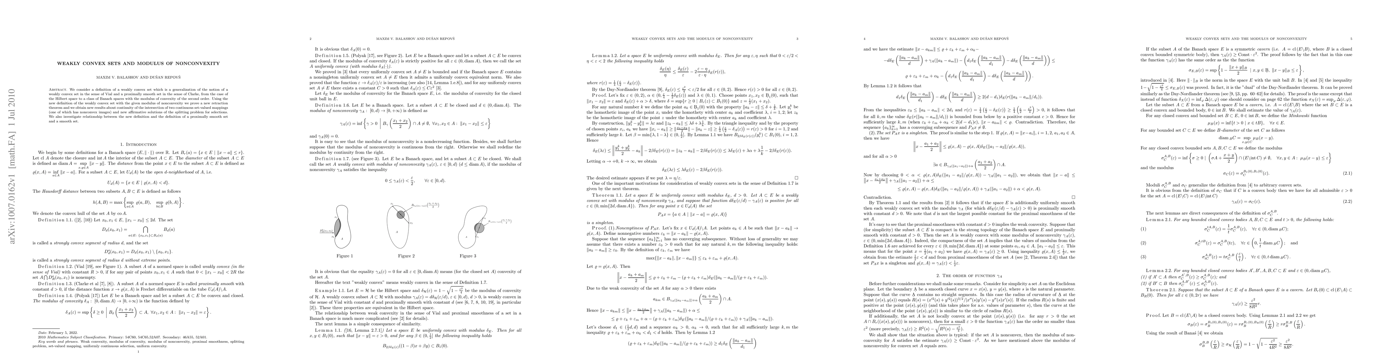 We consider a definition of a weakly convex set which is a generalization of the notion of a weakly convex set in the sense of Vial and a proximally smooth set in the sense of Clarke, from the case of the Hilbert space to a class of Banach spaces with the modulus of convexity of the second order. Using the new definition of the weakly convex set with the given modulus of nonconvexity we prove a new retraction theorem and we obtain new results about continuity of the intersection of two continuous set-valued mappings (one of which has nonconvex images) and new affirmative solutions of the splitting problem for selections. We also investigate relationship between the new definition and the definition of a proximally smooth set and a smooth set.