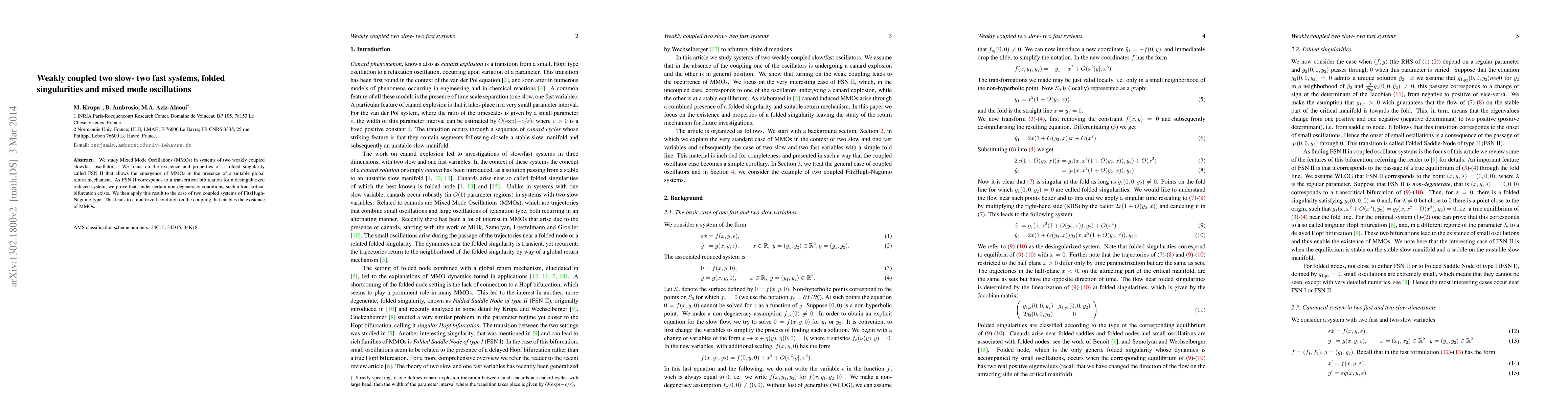 This paper investigates Mixed Mode Oscillations (MMOs) in weakly coupled slow/fast oscillators, focusing on the folded singularity FSN II that facilitates MMOs. It proves the existence of a transcritical bifurcation under non-degeneracy conditions, applying this to coupled FitzHugh-Nagumo systems to establish a condition for MMO emergence.