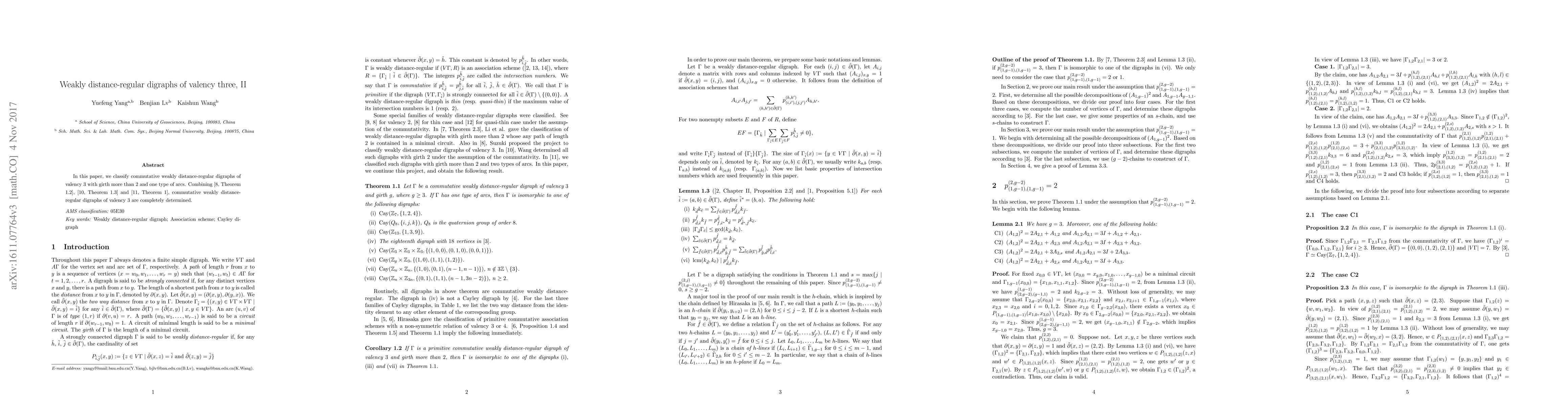 Summary: This paper classifies commutative weakly distance-regular digraphs of valency three with specific girth conditions and one arc type, leading to the complete determination of such digraphs through established theorems.