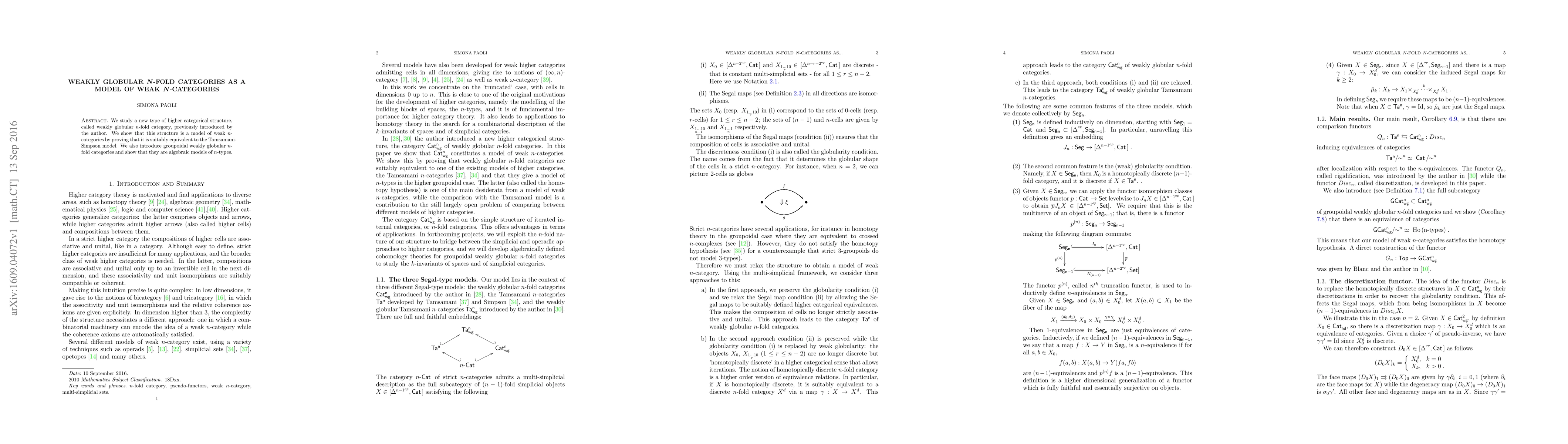 We study a new type of higher categorical structure, called weakly globular n-fold category, previously introduced by the author. We show that this structure is a model of weak n-categories by proving that it is suitably equivalent to the Tamsamani-Simpson model. We also introduce groupoidal weakly globular n-fold categories and show that they are algebraic models of n-types.