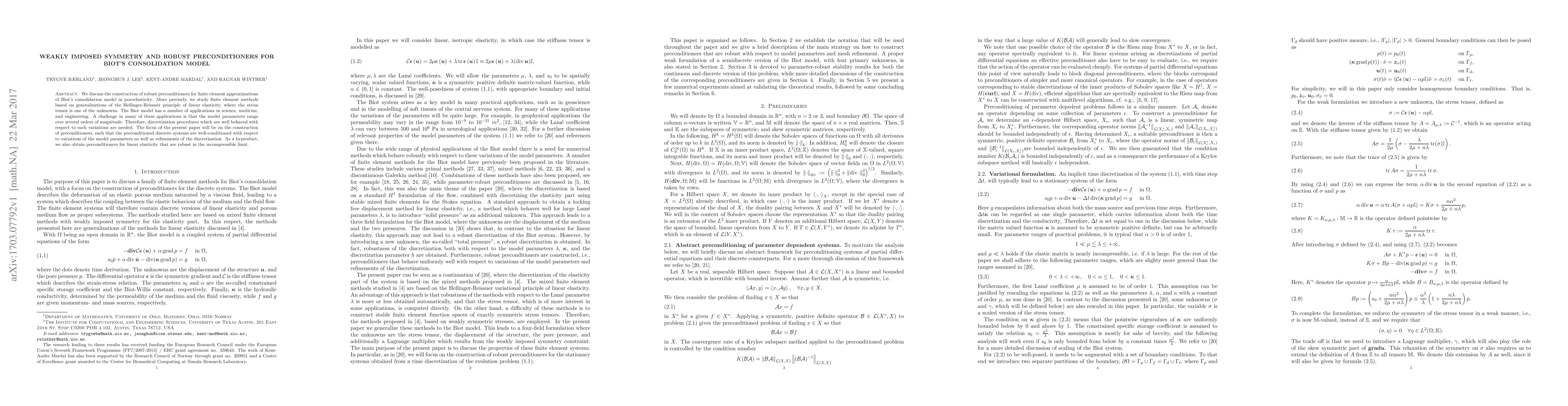 We discuss the construction of robust preconditioners for finite element approximations of Biot's consolidation model in poroelasticity. More precisely, we study finite element methods based on generalizations of the Hellinger-Reissner principle of linear elasticity, where the stress tensor is one of the unknowns. The Biot model has a number of applications in science, medicine, and engineering. A challenge in many of these applications is that the model parameters range over several orders of magnitude. Therefore, discretization procedures which are well behaved with respect to such variations are needed. The focus of the present paper will be on the construction of preconditioners, such that the preconditioned discrete systems are well-conditioned with respect to variations of the model parameters as well as refinements of the discretization. As a byproduct, we also obtain preconditioners for linear elasticity that are robust in the incompressible limit.
