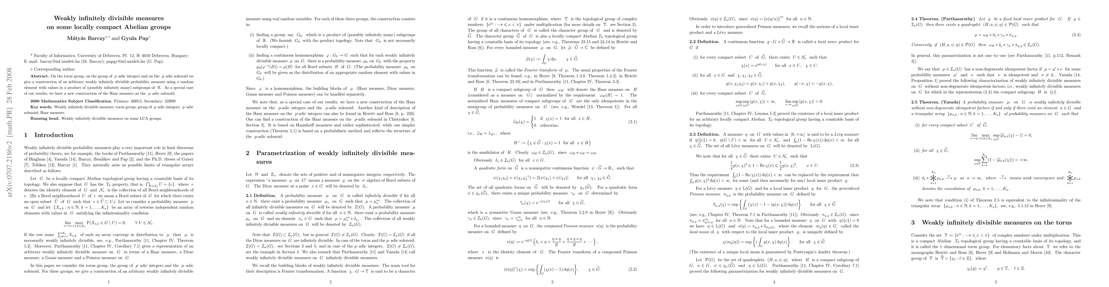 On the torus group, on the group of p-adic integers and on the p-adic solenoid, we give a construction of an arbitrary weakly infinitely divisible probability measure using a random element with values in a product of (possibly infinitely many) subgroups of the real numbers. As a special case of our results, we have a new construction of the Haar measure on the p-adic solenoid.
