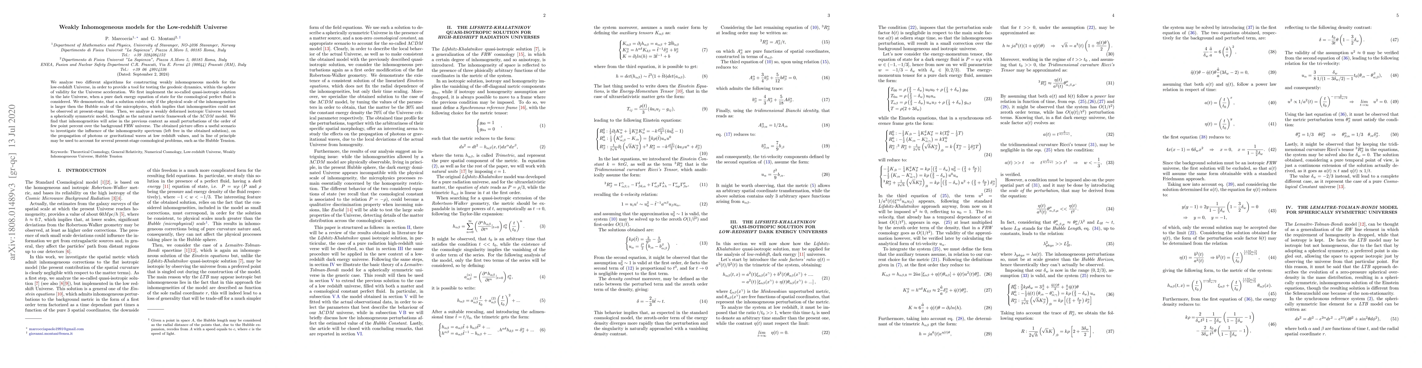 We analyze two different algorithms for constructing weakly inhomogeneous models for the low-redshift Universe, in order to provide a tool for testing the geodesic dynamics, within the sphere of validity for the Universe acceleration. We first implement the so-called quasi-isotropic solution in the late Universe, when a pure dark energy equation of state for the cosmological perfect fluid is considered. We demonstrate, that a solution exists only if the physical scale of the inhomogeneities is larger then the Hubble scale of the microphysics, which implies that inhomogeneities could not be observed at present-stage time. Then, we analyze a weakly deformed isotropic Universe toward a spherically symmetric model, thought as the natural metric framework of the {\Lambda}CDM model. We find that inhomogeneities will arise in the previous context as small perturbations of the order of few point percent over the background FRW universe. The obtained picture offers a useful scenario to investigate the influence of the inhomogeneity spectrum (left free in the obtained solution), on the propagation of photons or gravitational waves at low redshift values, and in line of principle may be used to account for several present-stage cosmological problems, such as the Hubble Tension.