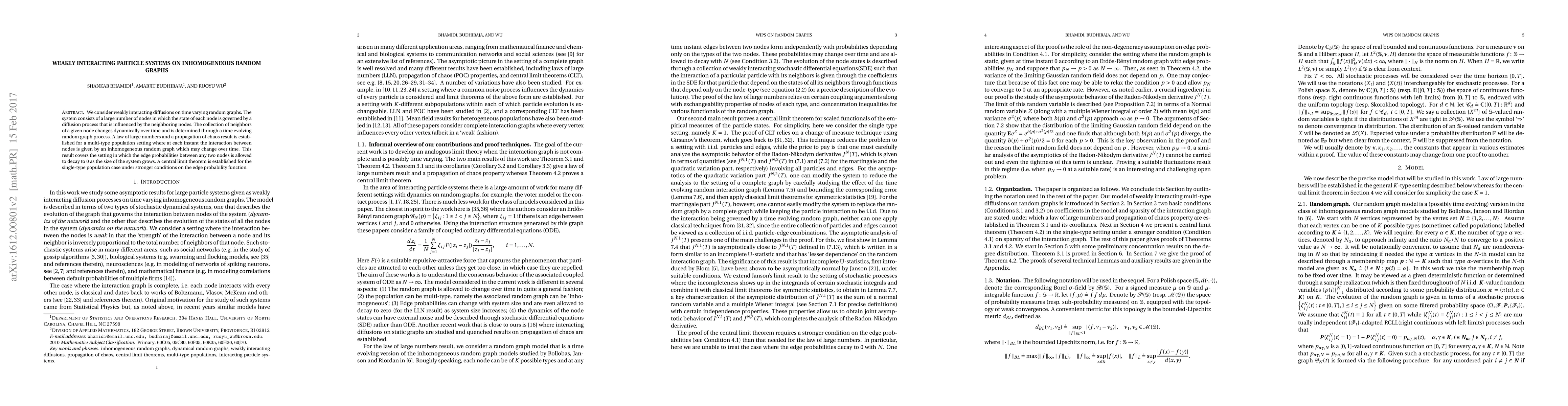 This paper studies weakly interacting diffusions on time-varying random graphs, establishing a law of large numbers and a propagation of chaos for multi-type populations, and a central limit theorem for single-type populations under specific conditions on edge probabilities.