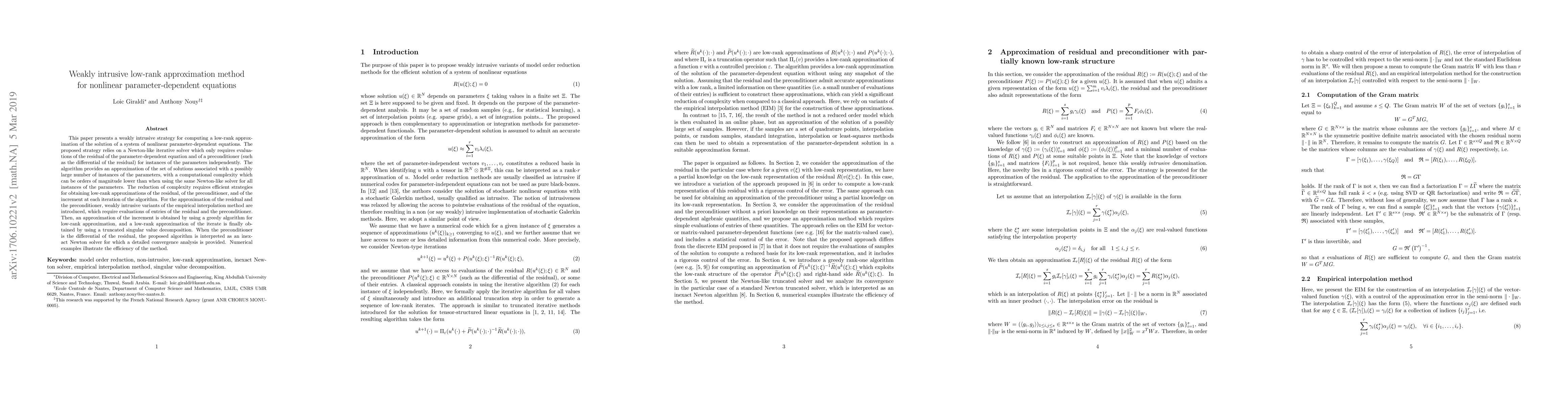 This paper introduces a weakly intrusive low-rank approximation method for solving nonlinear parameter-dependent equations, utilizing an iterative solver that significantly reduces computational complexity. It employs weakly intrusive variants of the empirical interpolation method and a greedy algorithm for low-rank approximations, demonstrating efficiency through numerical examples.