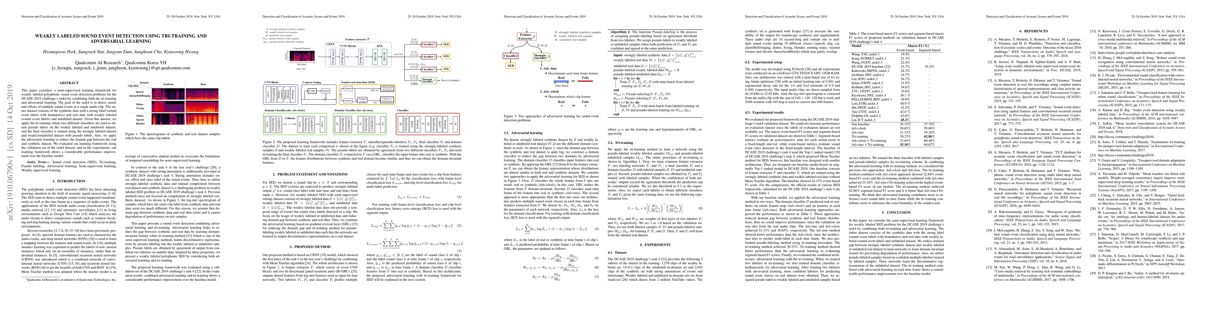 This paper considers a semi-supervised learning framework for weakly labeled polyphonic sound event detection problems for the DCASE 2019 challenge's task4 by combining both the tri-training and adversarial learning. The goal of the task4 is to detect onsets and offsets of multiple sound events in a single audio clip. The entire dataset consists of the synthetic data with a strong label (sound event labels with boundaries) and real data with weakly labeled (sound event labels) and unlabeled dataset. Given this dataset, we apply the tri-training where two different classifiers are used to obtain pseudo labels on the weakly labeled and unlabeled dataset, and the final classifier is trained using the strongly labeled dataset and weakly/unlabeled dataset with pseudo labels. Also, we apply the adversarial learning to reduce the domain gap between the real and synthetic dataset. We evaluated our learning framework using the validation set of the task4 dataset, and in the experiments, our learning framework shows a considerable performance improvement over the baseline model.