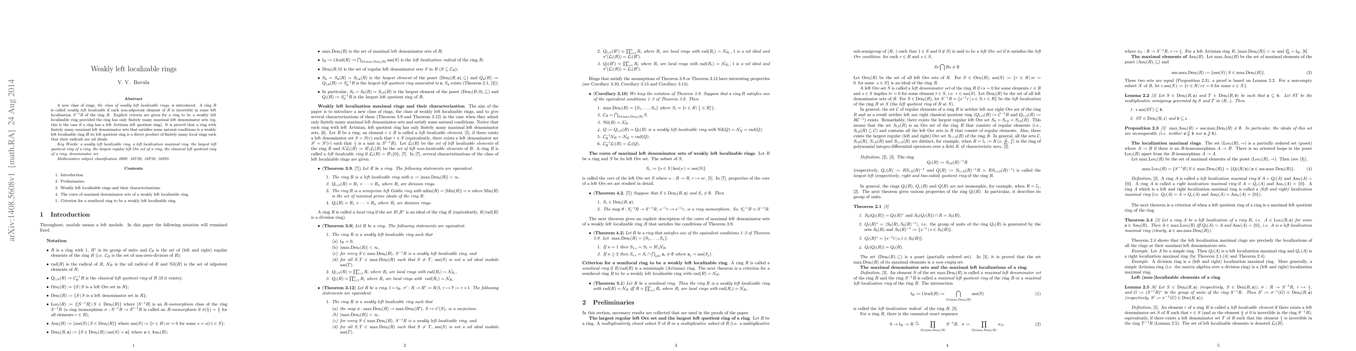 A new class of rings, {\em the class of weakly left localizable rings}, is introduced. A ring $R$ is called {\em weakly left localizable} if each non-nilpotent element of $R$ is invertible in some left localization $S^{-1}R$ of the ring $R$. Explicit criteria are given for a ring to be a weakly left localizable ring provided the ring has only finitely many maximal left denominator sets (eg, this is the case if a ring has a left Artinian left quotient ring). It is proved that a ring with finitely many maximal left denominator sets that satisfies some natural conditions is a weakly left localizable ring iff its left quotient ring is a direct product of finitely many local rings such that their radicals are nil ideals.