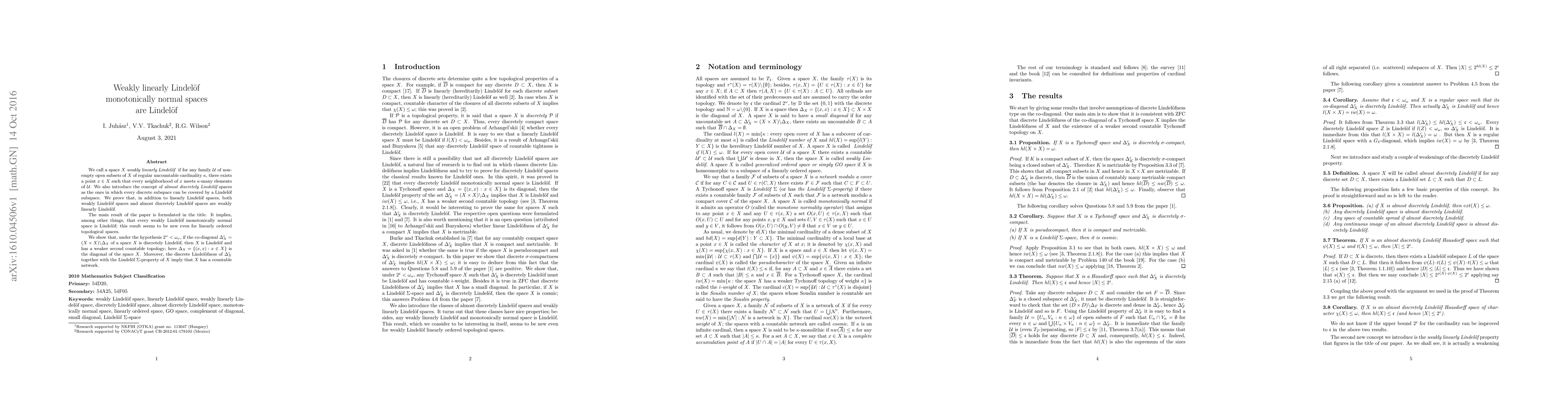 This paper proves that weakly linearly Lindel\"of monotonically normal spaces are Lindel\"of. It also explores the relationship between weakly linearly Lindel\"of spaces and almost discretely Lindel\"of spaces, showing that both are weakly linearly Lindel\"of. Additionally, it discusses conditions under which the co-diagonal of a space being discretely Lindel\"of implies the space itself is Lindel\"of and has a weaker second countable topology.