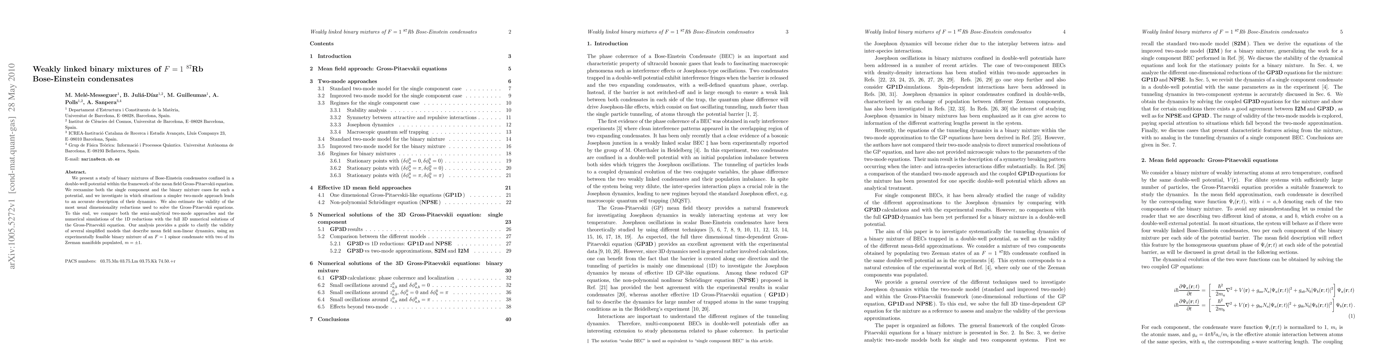We present a study of binary mixtures of Bose-Einstein condensates confined in a double-well potential within the framework of the mean field Gross-Pitaevskii equation. We reexamine both the single component and the binary mixture cases for such a potential, and we investigate in which situations a simpler two-mode approach leads to an accurate description of their dynamics. We also estimate the validity of the most usual dimensionality reductions used to solve the Gross-Pitaevskii equations. To this end, we compare both the semi-analytical two-mode approaches and the numerical simulations of the 1D reductions with the full 3D numerical solutions of the Gross-Pitaevskii equation. Our analysis provides a guide to clarify the validity of several simplified models that describe mean field non-linear dynamics, using an experimentally feasible binary mixture of an F=1 spinor condensate with two of its Zeeman manifolds populated, m=+1 and m=-1.