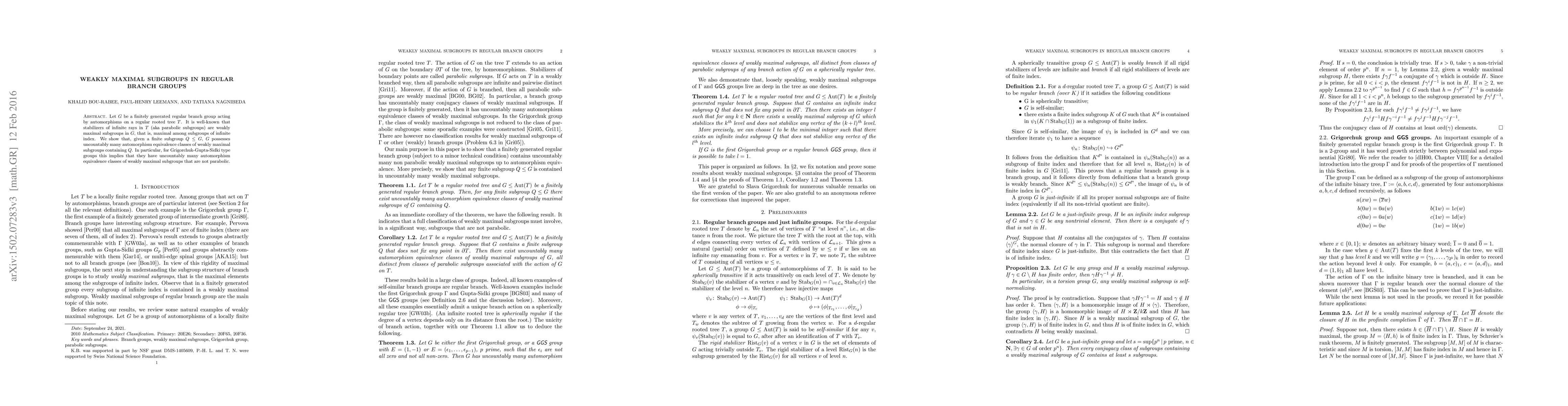 Let $G$ be a finitely generated regular branch group acting by automorphisms on a regular rooted tree $T$. It is well-known that stabilizers of infinite rays in $T$ (aka parabolic subgroups) are weakly maximal subgroups in $G$, that is, maximal among subgroups of infinite index. We show that, given a finite subgroup $Q\leq G$, $G$ possesses uncountably many automorphism equivalence classes of weakly maximal subgroups containing $Q$. In particular, for Grigorchuk-Gupta-Sidki type groups this implies that they have uncountably many automorphism equivalence classes of weakly maximal subgroups that are not parabolic.